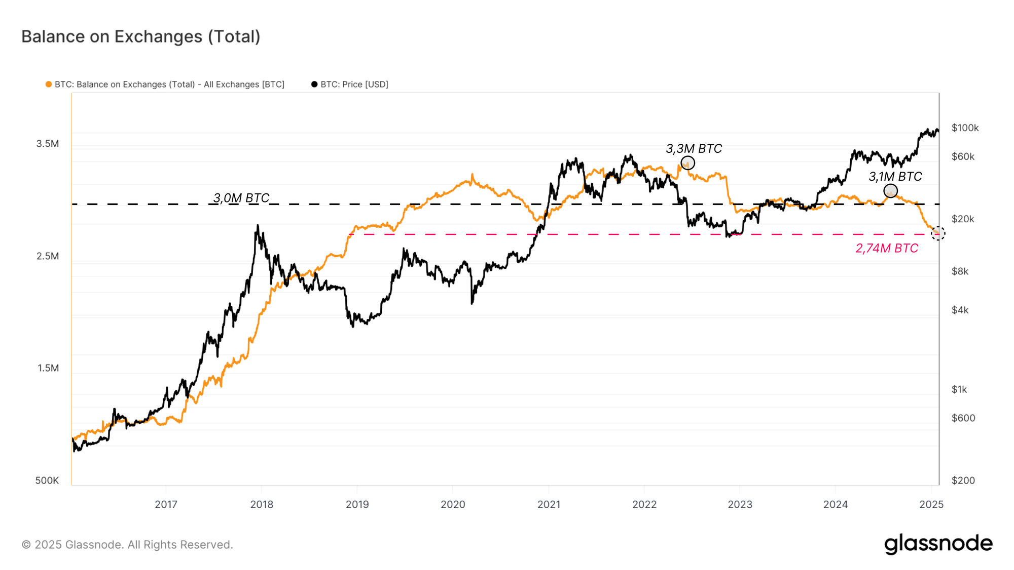 Les soldes de BTC sur les exchanges centralisés sont tombés à 2,7 millions de BTC, contre 3,1 millions de BTC en juillet 2024.