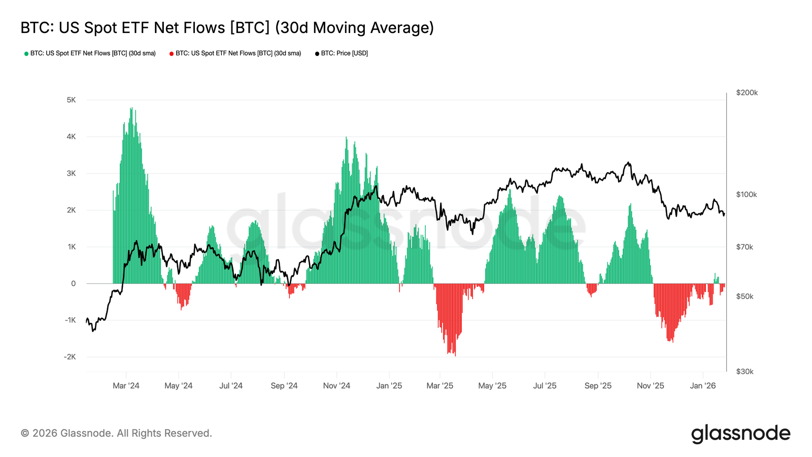 Le prix du BTC se maintenant dans une fourchette plus élevée malgré un ralentissement de la dynamique des entrées, le marché semble s'appuyer davantage sur la conviction des détenteurs au comptant que sur une nouvelle demande tirée par les ETF.