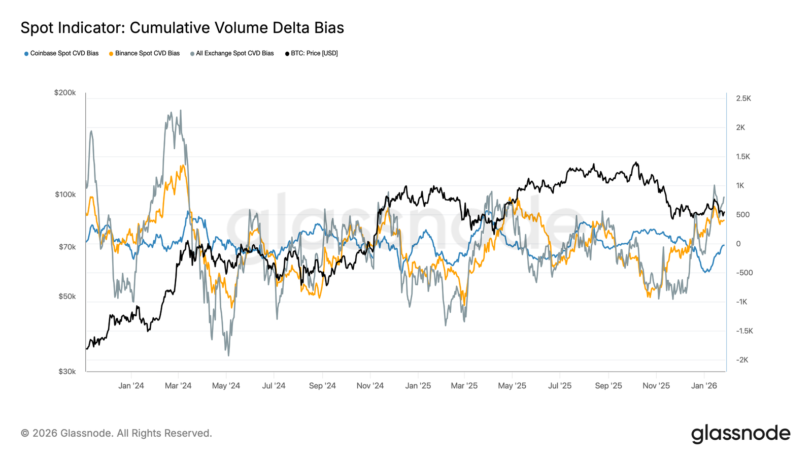 Cependant, la situation générale des flux s'est stabilisée. La pression à la vente des ETF s'est atténuée et le positionnement du marché au comptant montre des signes précurseurs d'amélioration, en particulier à l'étranger, ce qui suggère que l'intérêt des acheteurs commence à se reconstituer.