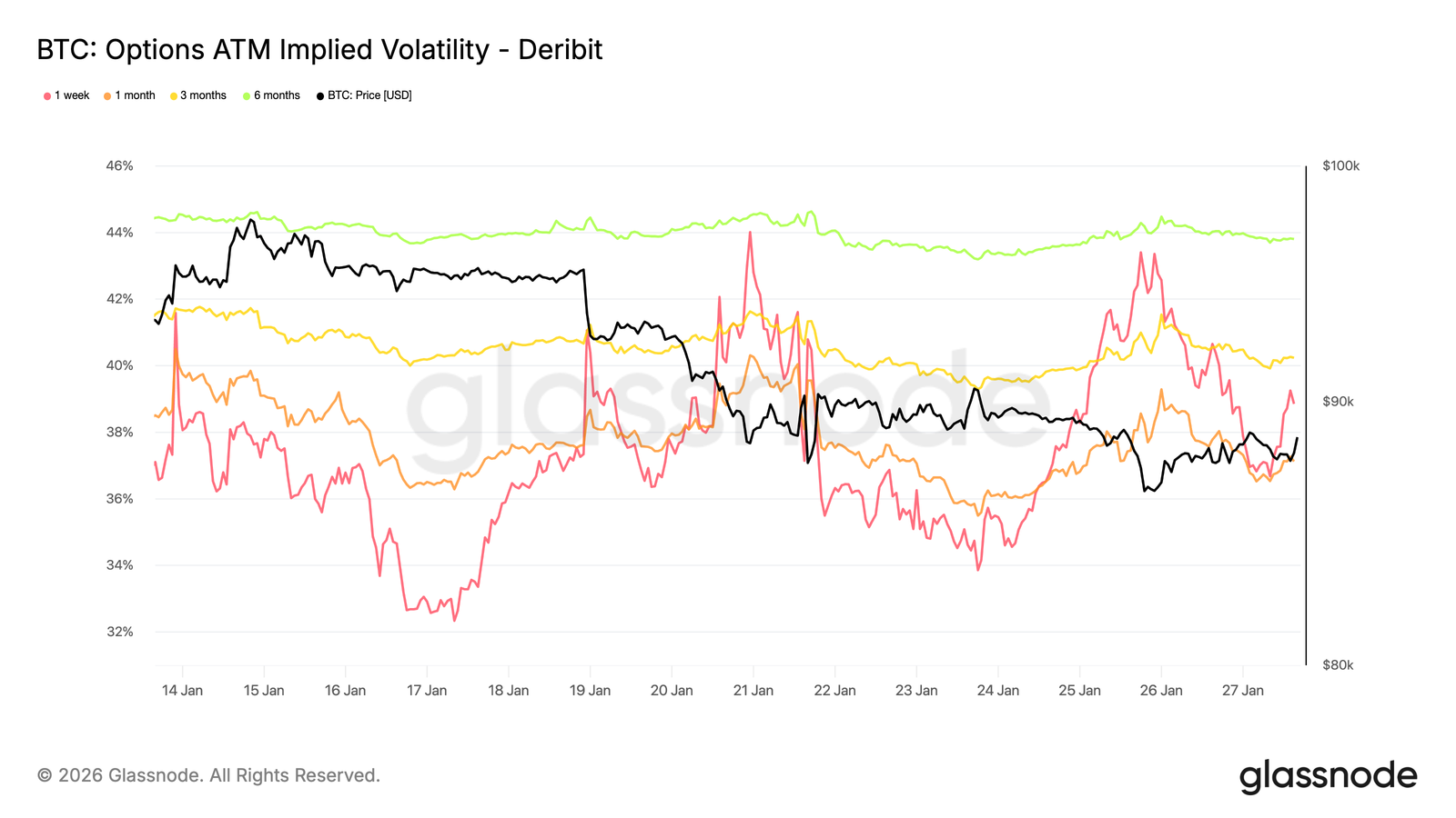 Au cours du week-end, la volatilité implicite à court terme des actions cotées à parité a fortement augmenté, reflétant une sensibilité accrue à l'environnement de risque à court terme plutôt qu'à des tensions spécifiques aux cryptomonnaies.