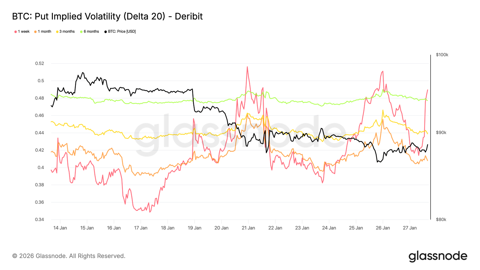 Cette divergence reflète la réaction du marché à la baisse du Bitcoin, qui est passé d'une fourchette de 90 000 dollars à une fourchette de 80 000 dollars, en couvrant la baisse à court terme, tout en restant à l'aise avec la vente de protections à plus long terme. Cette structure indique une prudence à court terme sans détérioration plus générale des anticipations de risque à long terme.