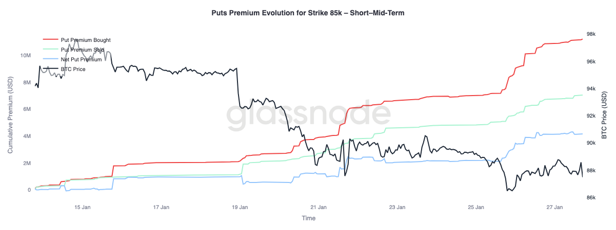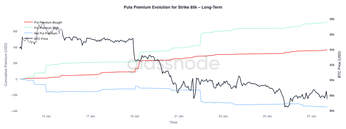 En zoomant sur l'évolution de la prime d'option de vente au prix d'exercice de 85 000, on observe deux comportements distincts selon les échéances. À court et moyen terme, jusqu'à trois mois, les primes achetées ont clairement dominé les primes vendues, poussant les primes nettes d'option de vente à la hausse.