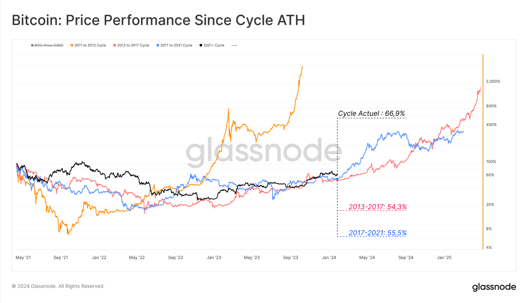 - L'évolution du cours du BTC depuis le creux de novembre 2022 présente des similitudes frappantes avec les cycles précédents : la reprise est un peu plus lente, mais plus résistante.