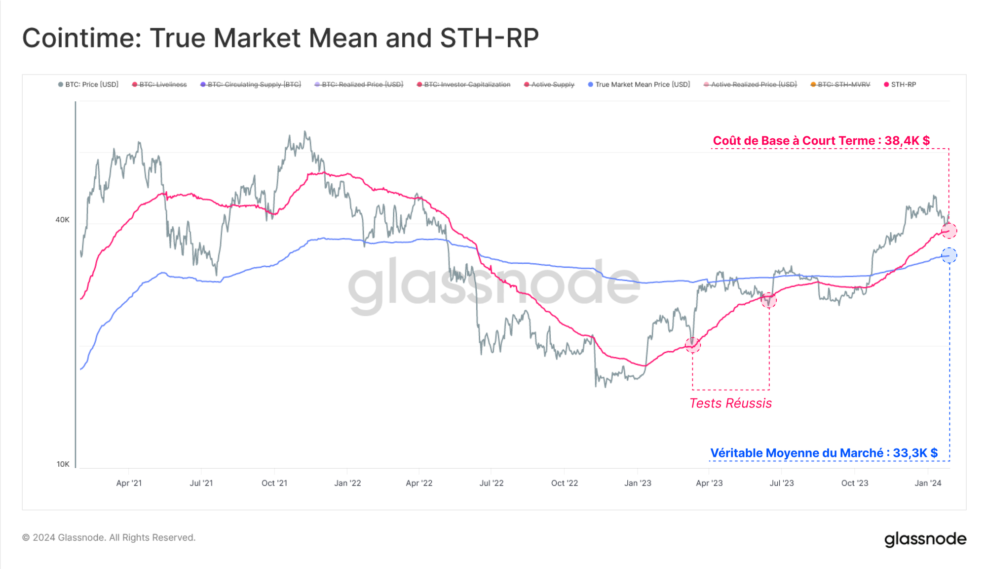 - 🔴 Le Coût de Base des Détenteurs à Court Terme (38,3 k$), décrivant le prix d'acquisition moyen des nouveaux entrants.