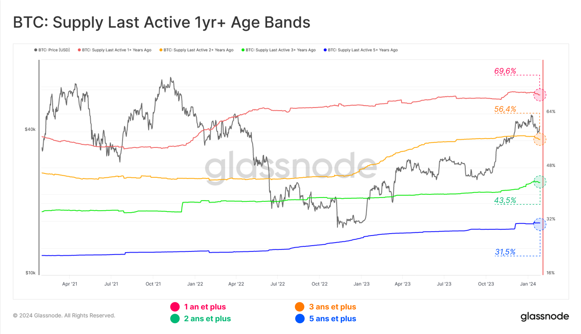 Cette série d'indicateurs mesure la proportion de l'offre en circulation qui a été conservée pendant plusieurs années. Nous pouvons observer une légère baisse sur les bandes de 1 an et 2 ans en particulier, dont beaucoup, mais pas toutes, sont associées au GBTC.