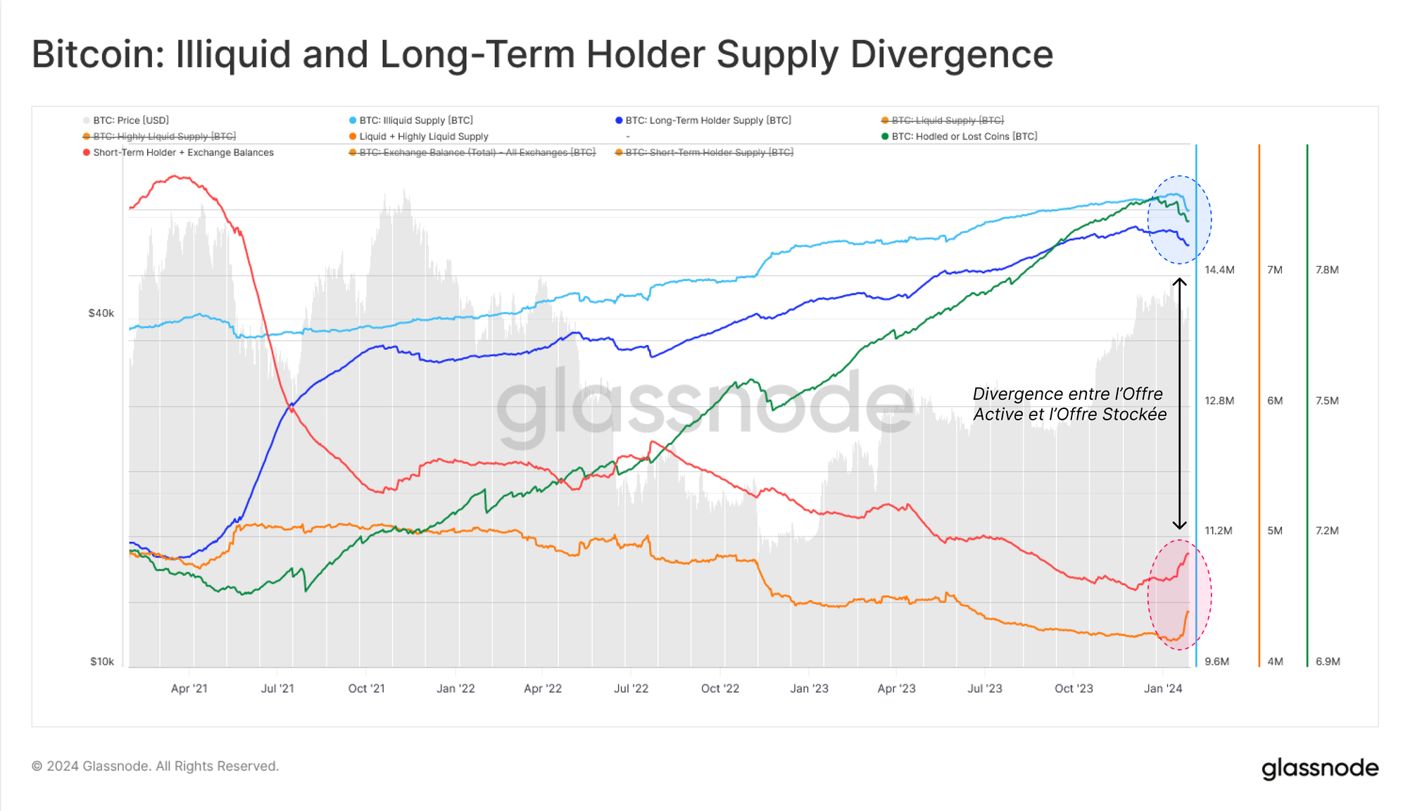 Au cours de la 46e semaine de l'année 2023, nous avons présenté et comparé plusieurs mesures de "l'offre stockée" et de "l'offre active". À l'époque, nous avions noté une grande divergence entre les deux, avec une prédominance significative des pièces dormantes, inactives et illiquides.