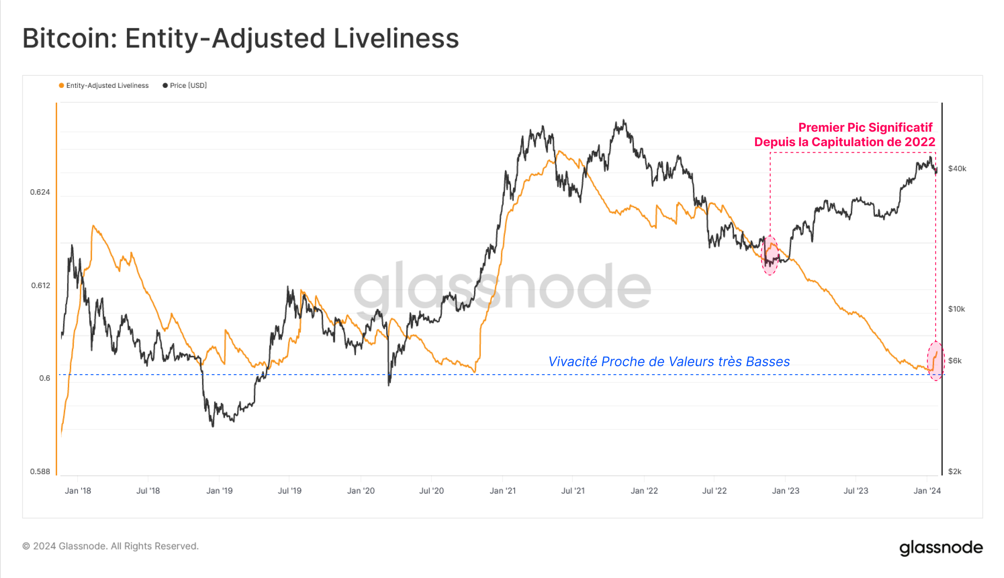 Cela a déclenché la plus forte augmentation de la vivacité depuis l'événement de capitulation de décembre 2022. Cela confirme une fois de plus l'analyse ci-dessus, dénotant une augmentation de la destruction de l'âge des pièces, certains investisseurs se séparant d'une partie des BTC qu'ils détiennent depuis longtemps.