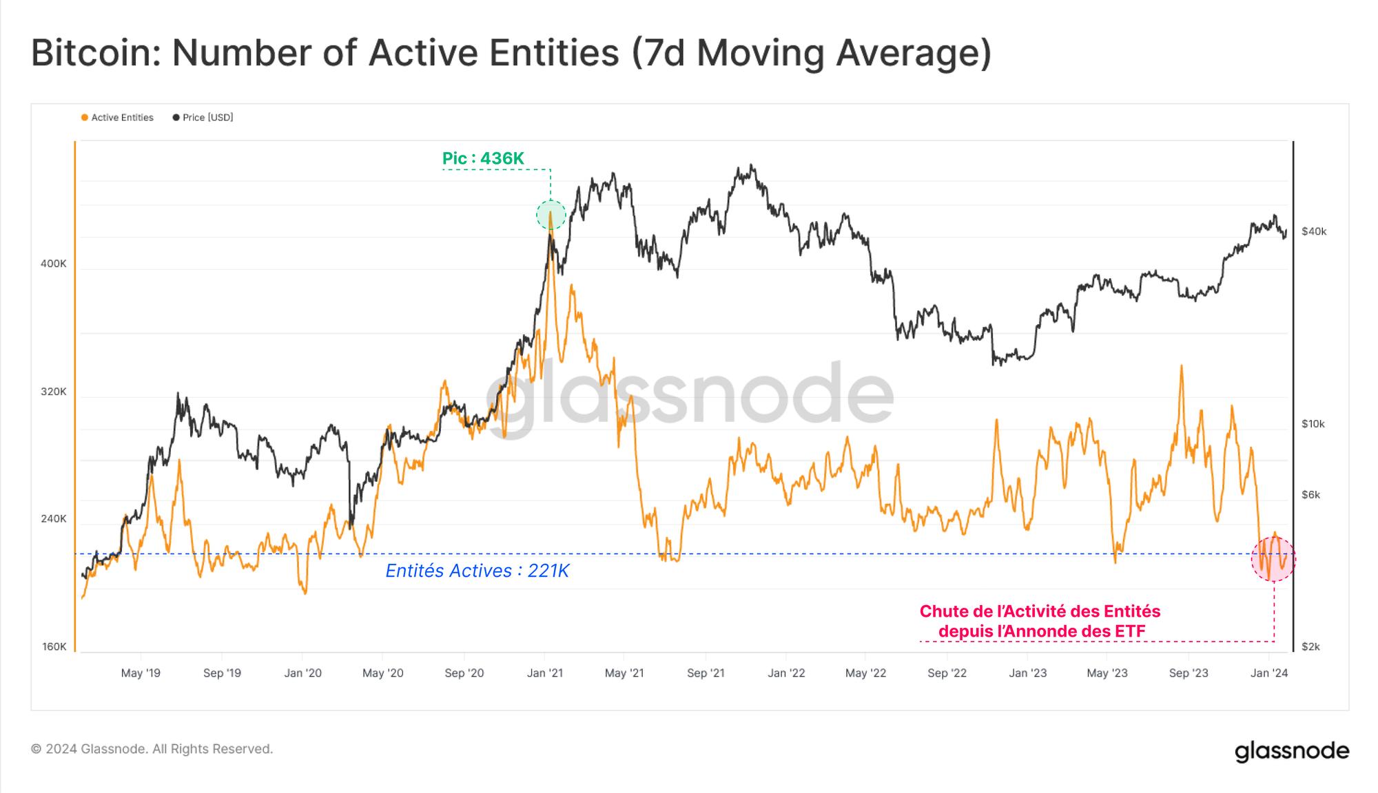 Cependant, malgré la forte performance du cours, une observation contre intuitive est apparue, le nombre d'entités actives baissant jusqu'à atteindre le niveau le plus bas du cycle, à savoir 219 000 par jour.