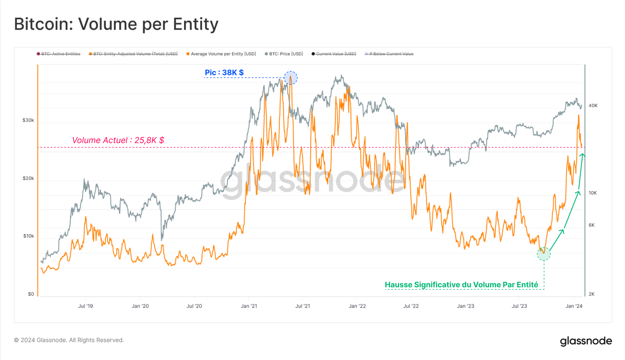 Les volumes on-chain ont également atteint des valeurs équivalentes au pic du marché haussier de 2021, et la taille moyenne de la valeur transférée met en évidence une présence croissante des investisseurs institutionnels et des grands investisseurs.