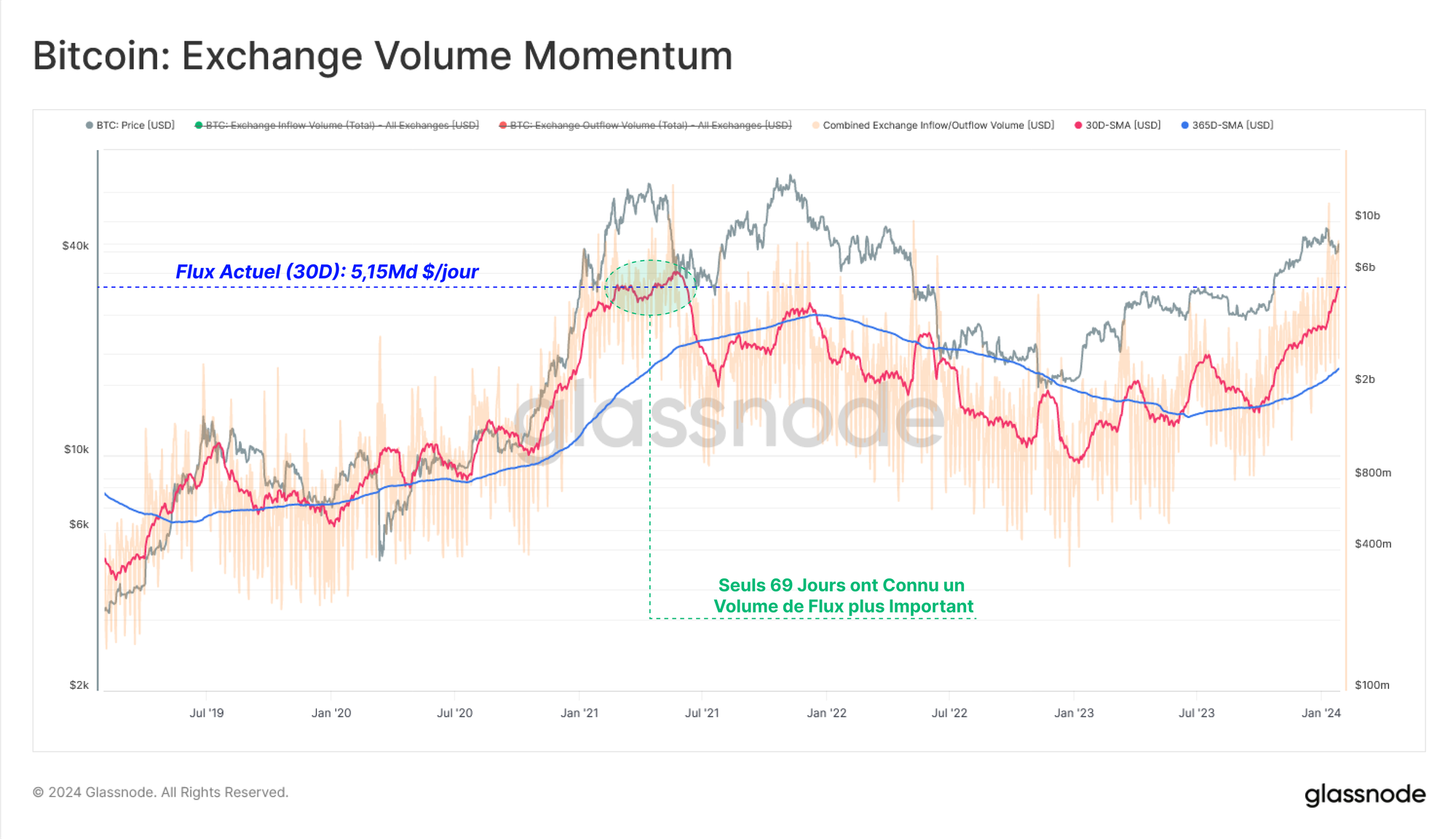 Le volume actuel entrant et sortant des exchanges rivalise avec les sommets atteints pendant le marché haussier de 2021, avec seulement 68 jours (1,5 %) enregistrant une valeur supérieure (sur la base de la moyenne mobile de 30 jours).