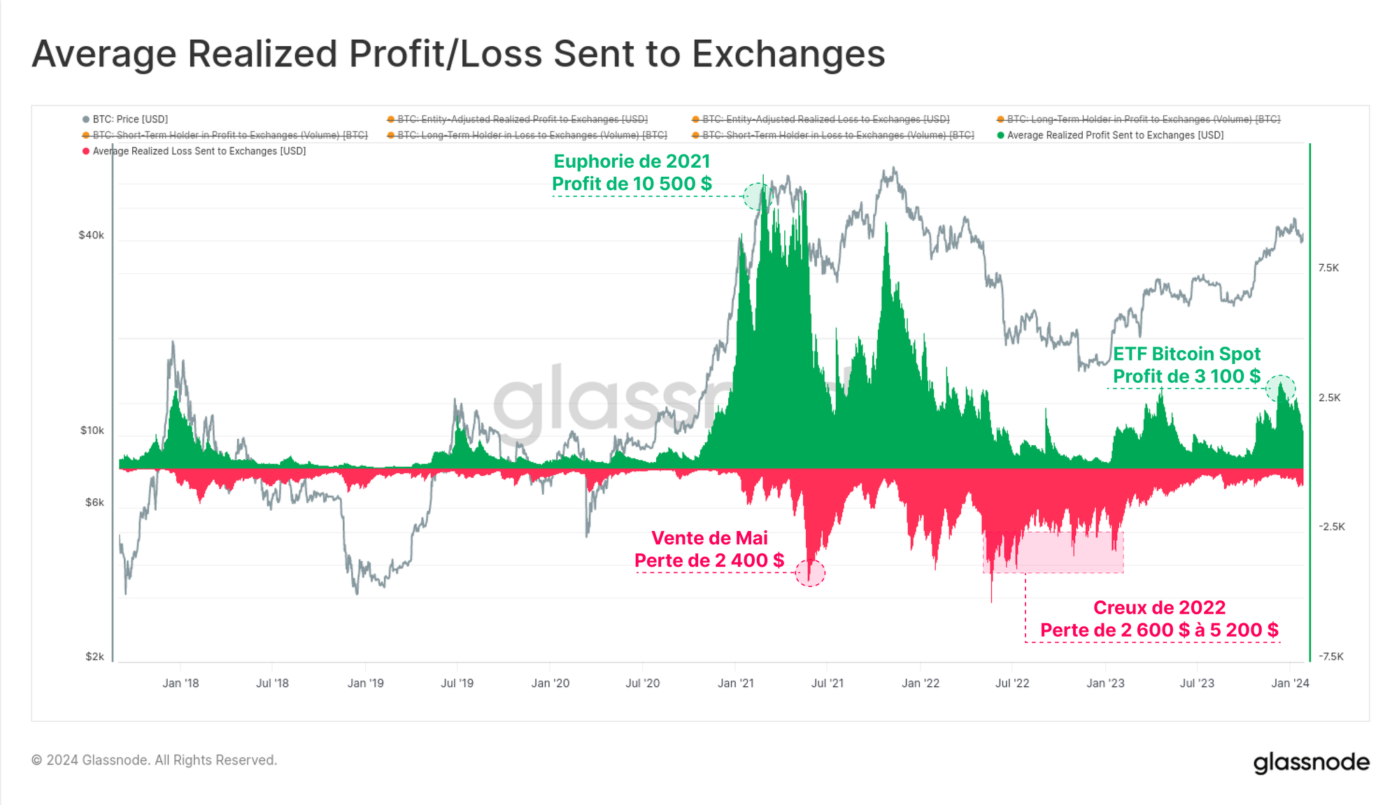 L'augmentation des flux des exchanges s'est accompagnée d'un régime de prise de bénéfices. Le graphique ci-dessous montre le profit (ou la perte) moyen par pièce envoyée aux exchanges.