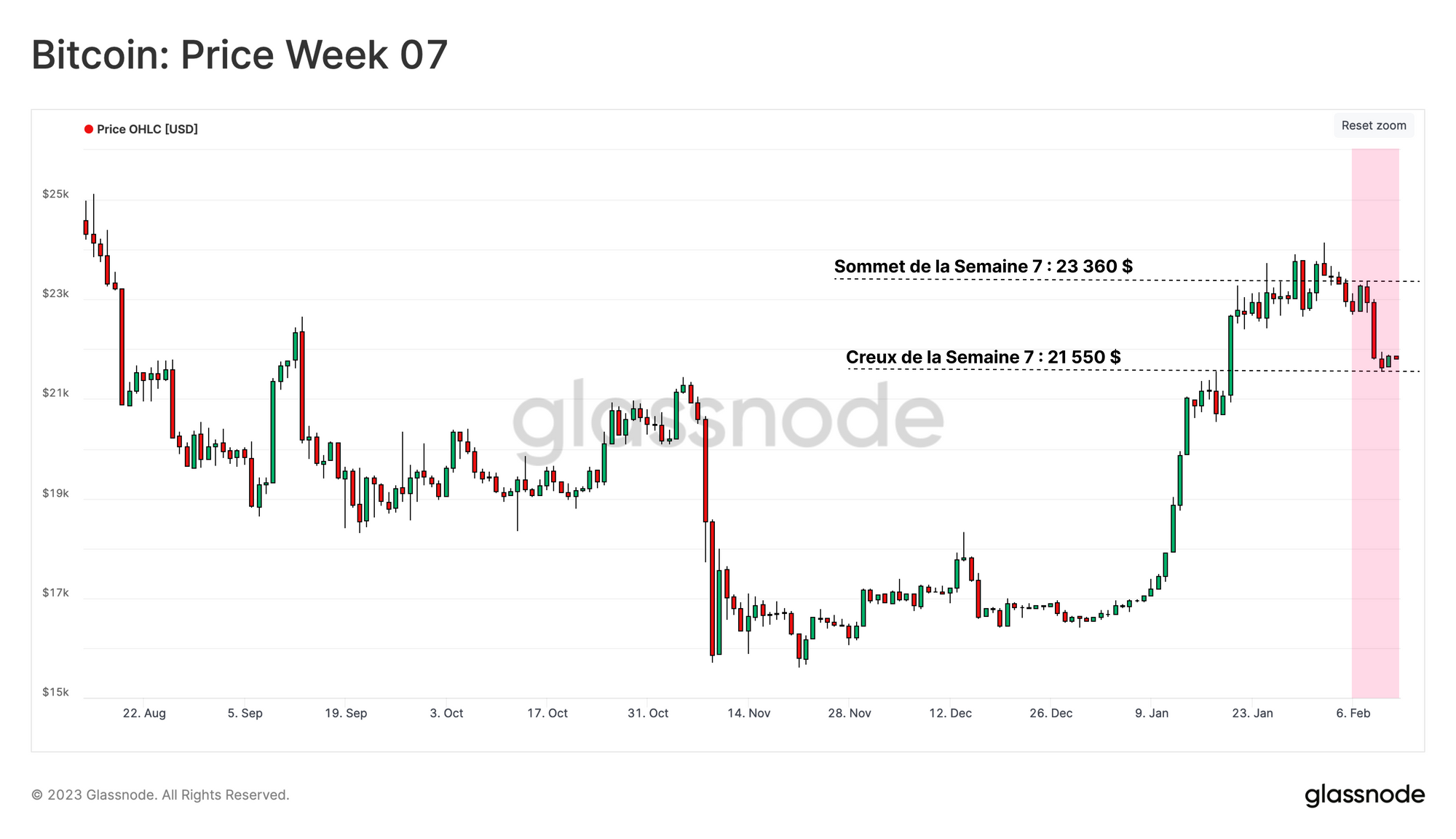 Le marché a connu sa première correction depuis la hausse de janvier, passant d'un sommet hebdomadaire de 23 300 dollars à un creux de 21 500 dollars. Cette évolution s'accompagne d'importantes nouvelles réglementaires en provenance des États-Unis, telles que l'amende infligée par la SEC à Kraken pour ses services de staking, l'action en justice de la SEC contre Paxos pour l'émission du stablecoin BUSD, ainsi que plusieurs actions contre des partenaires bancaires et des fournisseurs de paiement en crypto-monnaie.