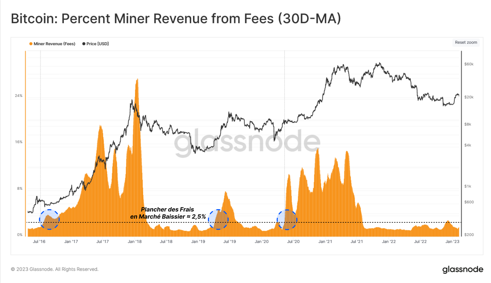 En regardant la moyenne mensuelle des revenus des mineurs provenant des frais, il est évident que cet indicateur n'a pas encore dépassé le taux plancher des frais du marché baissier (2,5 %) 🔵.
