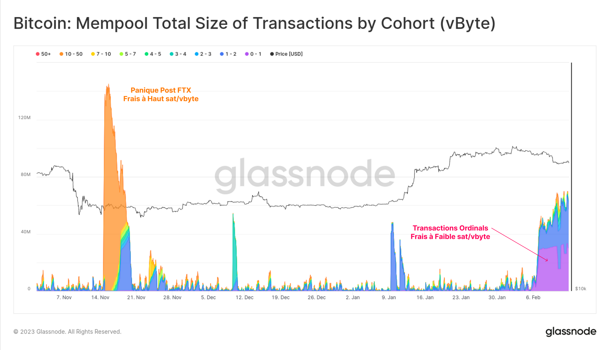 Un grand afflux de transactions à faibles frais (0 à 1sat/vbyte) peut être observé au sein du mempool, en violet 🟣. Ceci diffère de la panique post-FTX où le mempool était rempli de transactions urgentes et payantes, en orange 🟠.