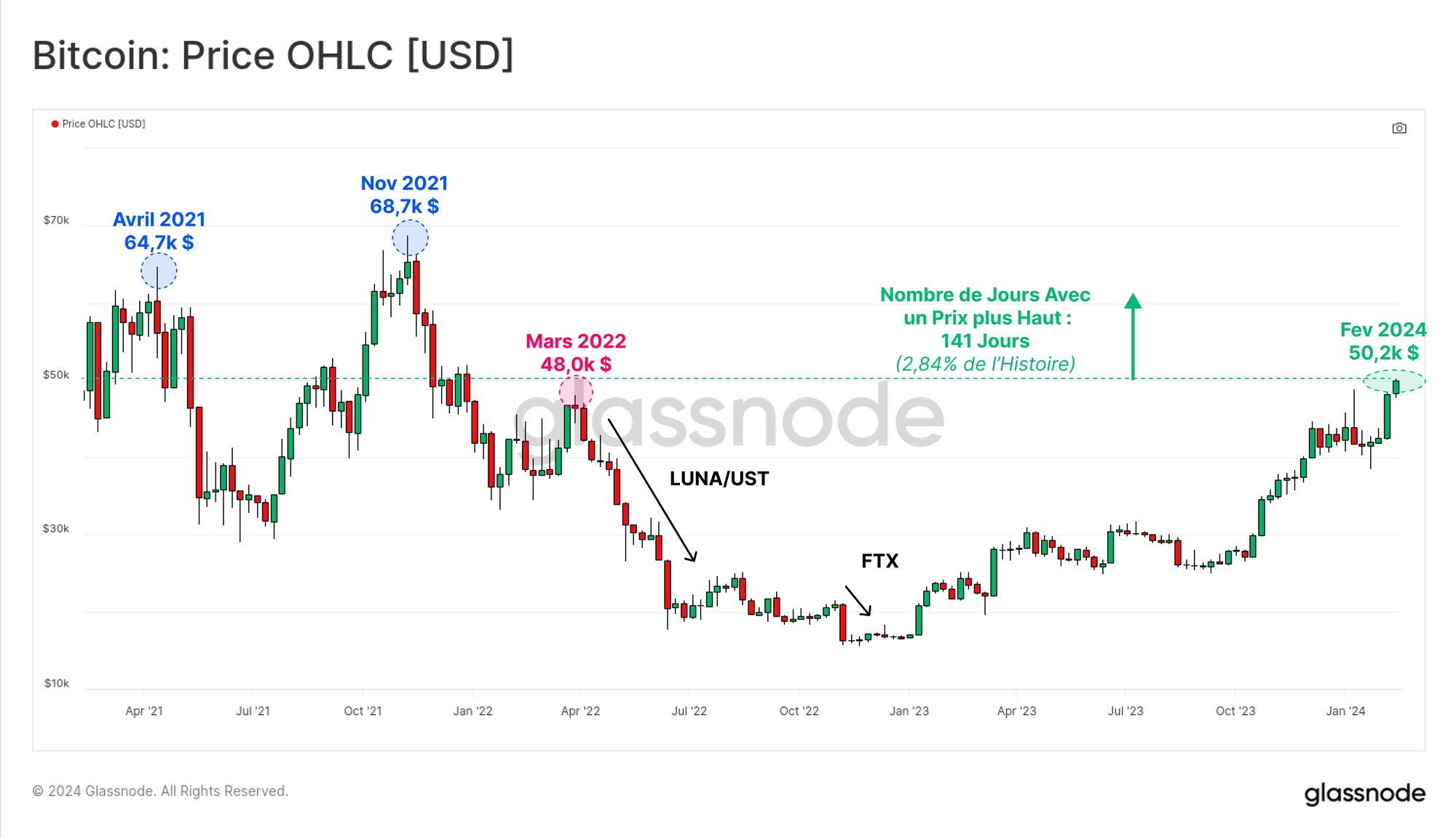 Seuls 141 jours en 2021 ont vu un prix de clôture quotidien supérieur à 50 200$, ce qui représente seulement 2,84 % de l'histoire du marché.