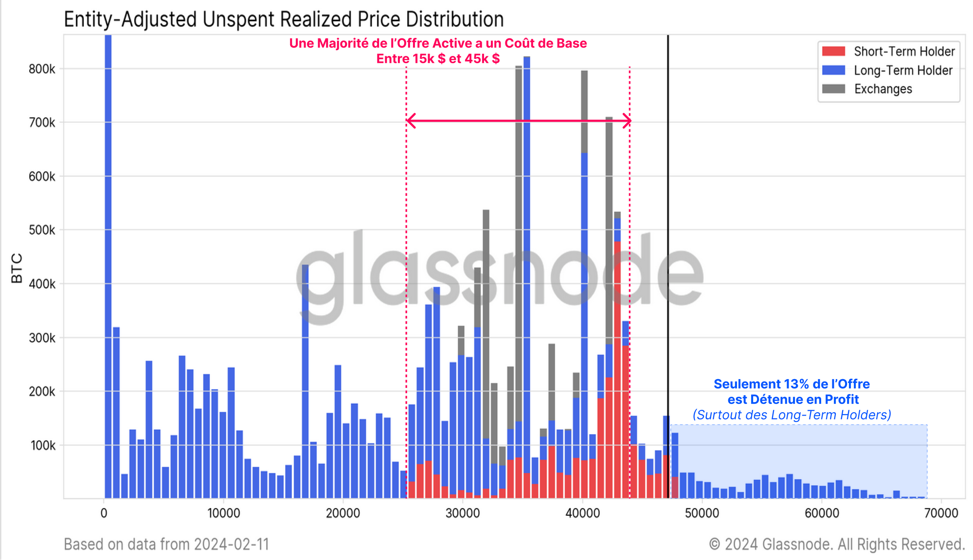 Le graphique ci-dessous présente une séparation de l'offre de BTC en fonction du coût de base auquel elle a été acquise. Nous pouvons voir que la grande majorité des pièces (87 %) ont été acquises à moins de 48 000 $, avec un très grand nombre de détenteurs à court terme situés entre 40 000 $ et 45 000 $. Les détenteurs à long terme dominent ces 13 % de l'offre détenue en perte, reflétant les "acheteurs de sommets" des 141 jours les plus élevés en 2021.