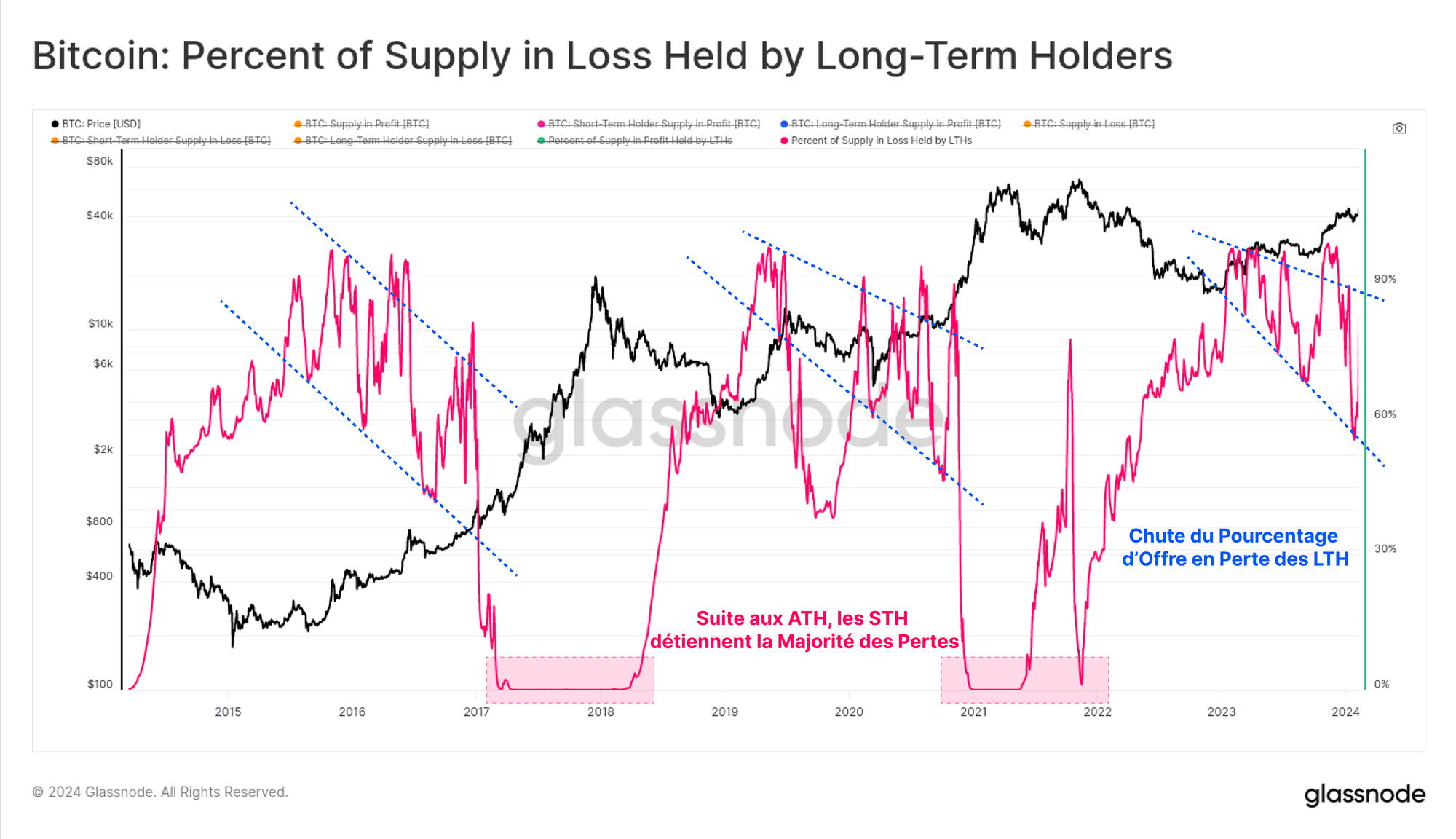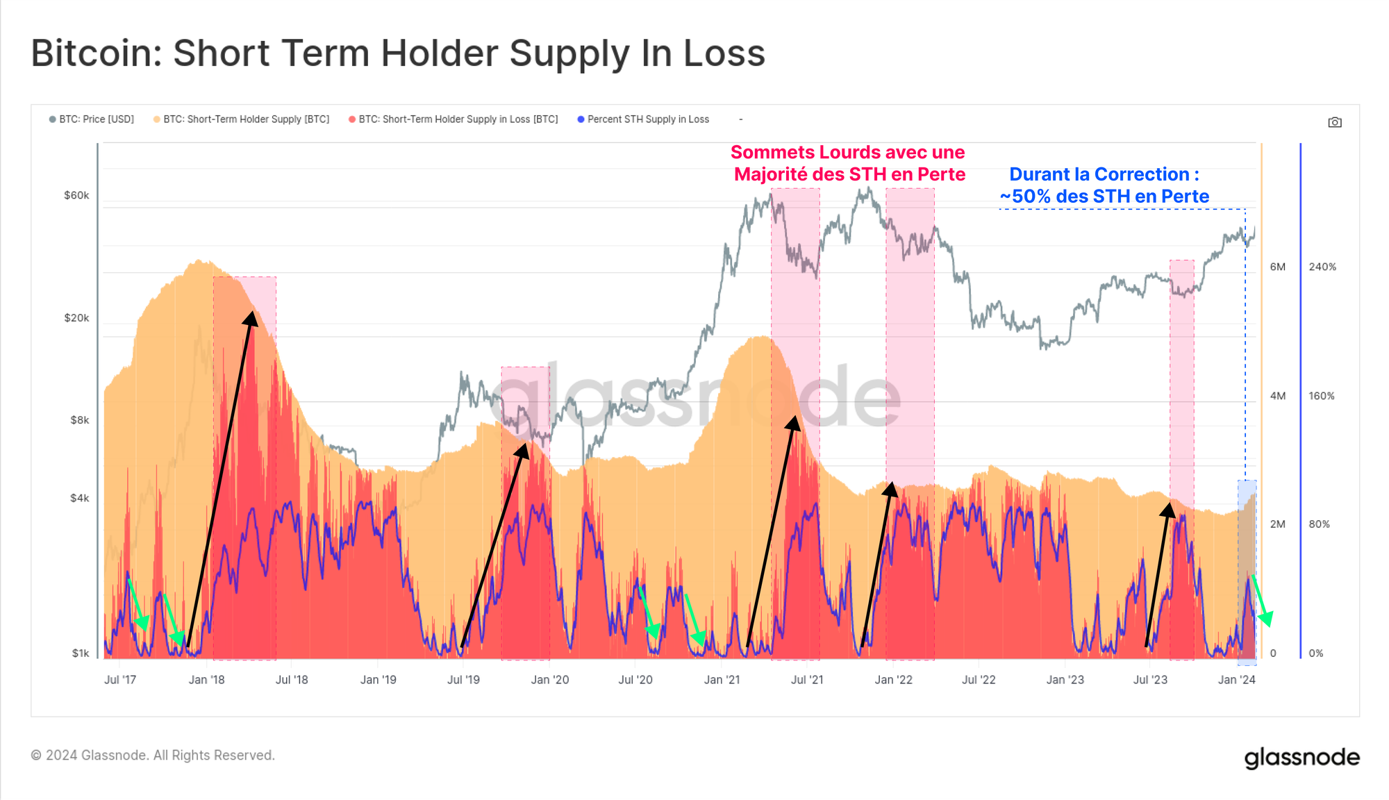 - Conditions de risque élevé - Lorsque l'offre de STH en perte augmente considérablement, souvent jusqu'à une majorité de leur total, cela suggère un marché "saturé". De nombreux investisseurs sont désormais piégés par un prix d'acquisition défavorable.