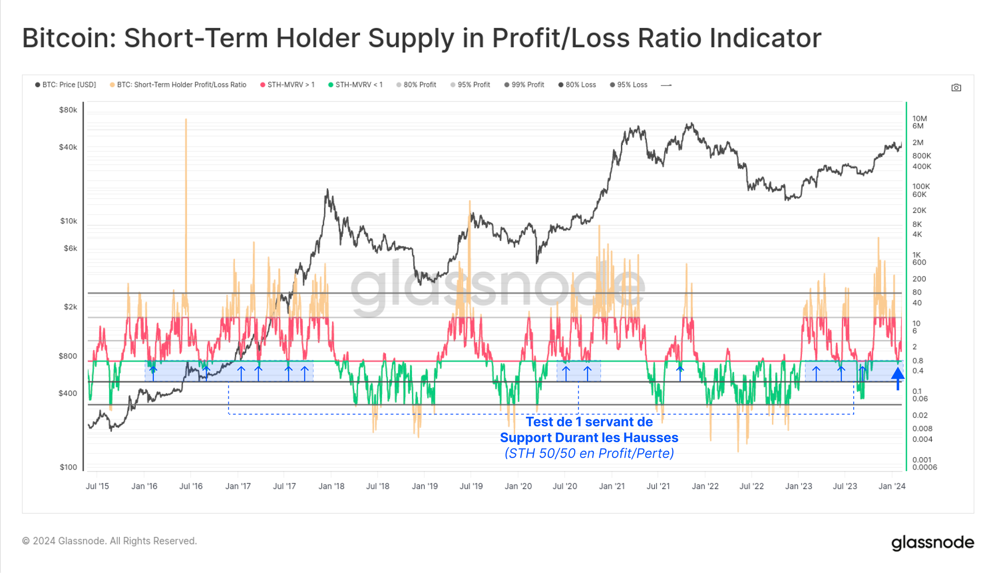 Nous pouvons également le constater via le graphique suivant, qui présente l'offre des STH en fonction du volume détenu en profit (orange) par rapport à la perte (rouge). Cela nous aide à visualiser et à distinguer les périodes de risque accru des corrections et des baisses plus "classiques".