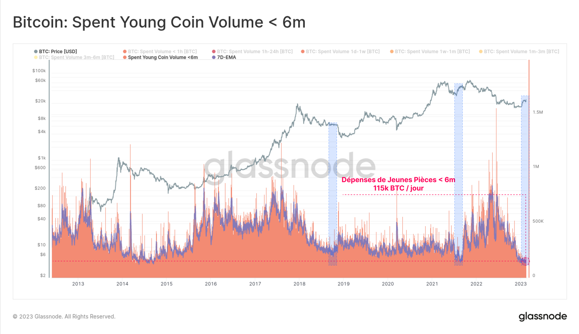 Il est intéressant de noter que, malgré l'augmentation du prix, la valeur du volume de pièces transférées reste extrêmement faible. Le graphique ci-dessous montre que moins de 115k BTC/jour en volume total de transfert (y compris les dépenses de la même pièce) est attribué aux pièces de moins de 6 mois. Des valeurs aussi faibles n'ont été observées qu'une poignée de fois dans l'histoire.