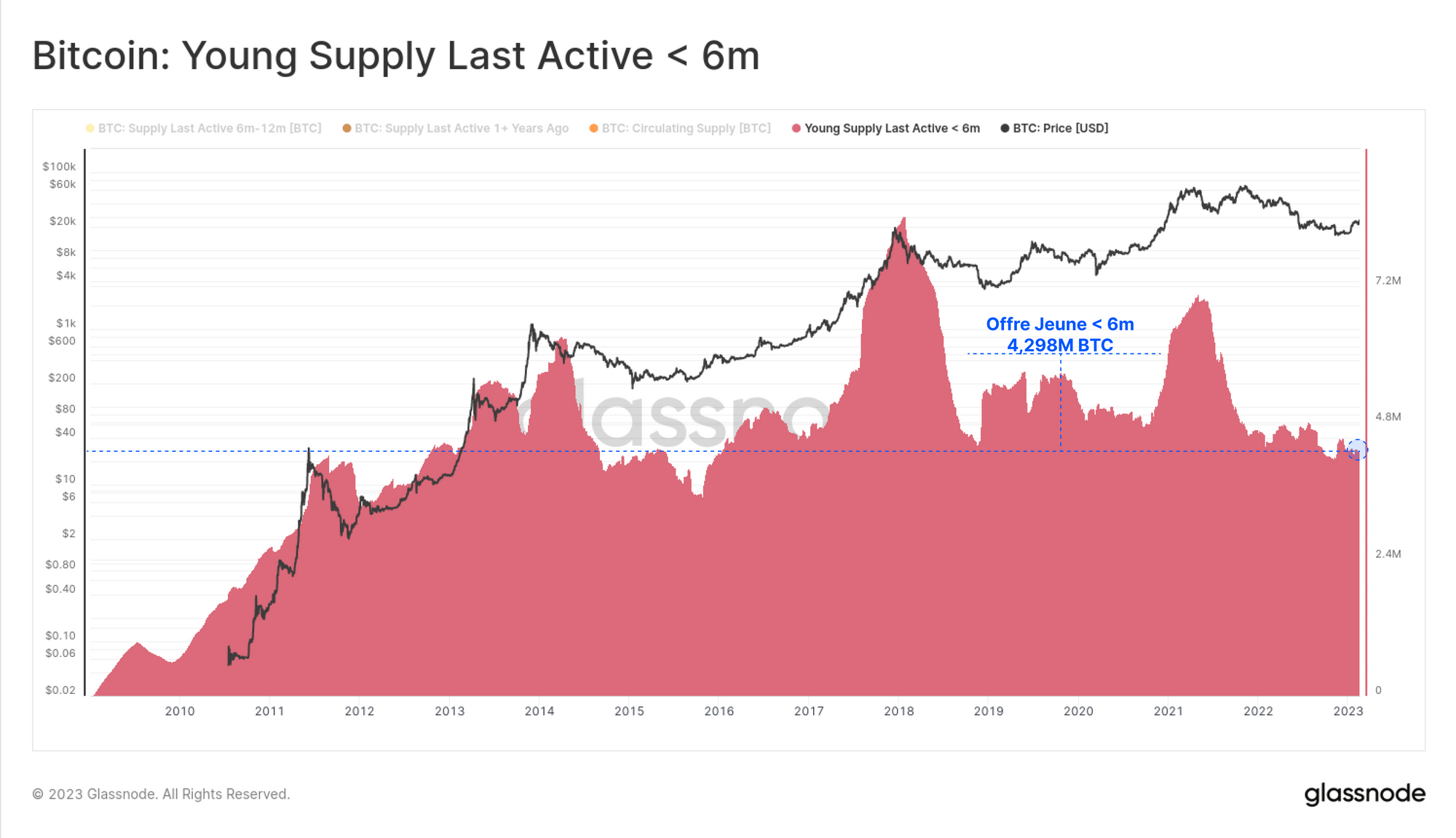 L'offre totale de pièces âgée de moins de six mois n'a pas augmenté de manière significative depuis le début de l'année, oscillant autour de 4,298 millions de BTC.
