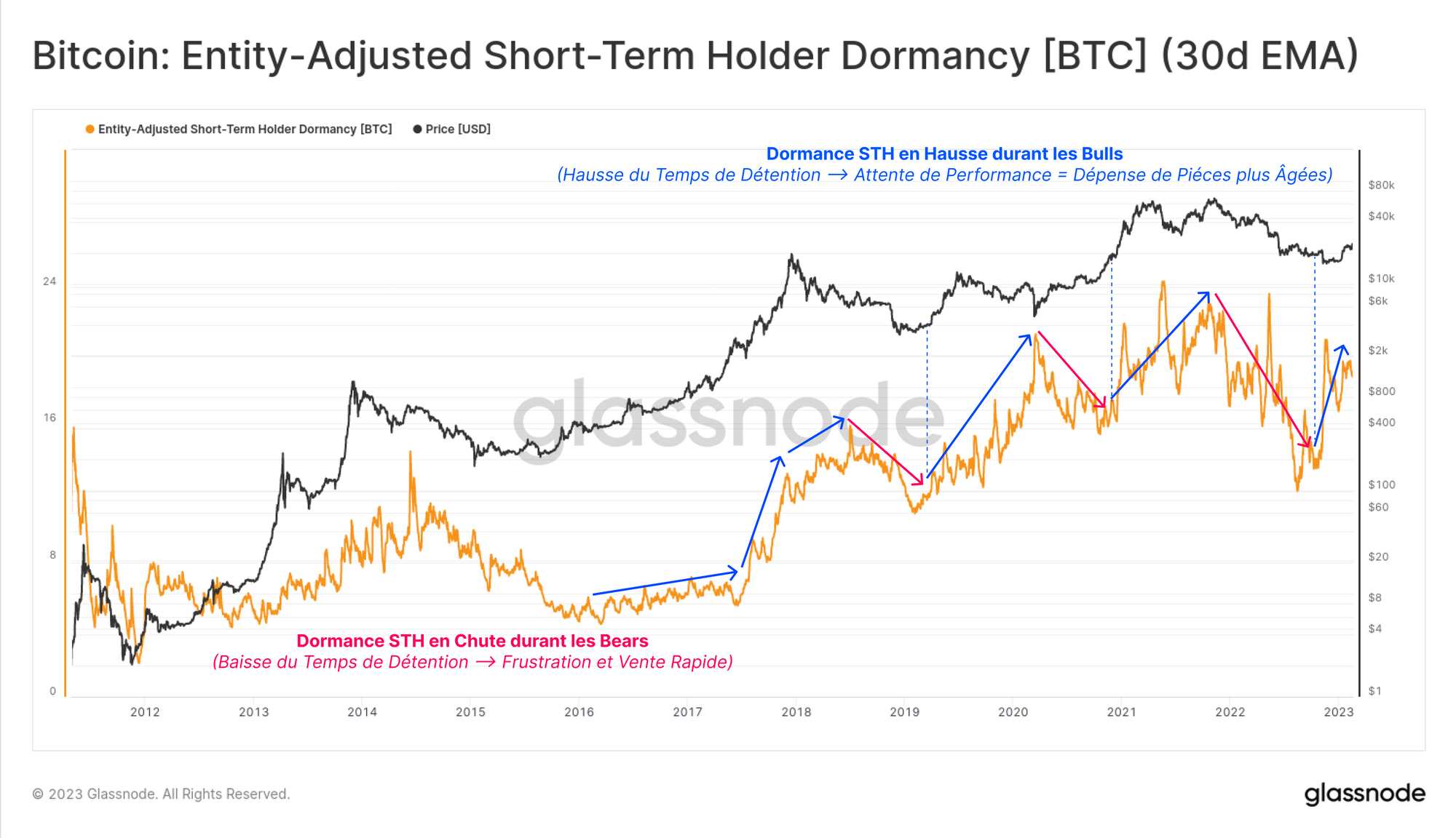Un fort mouvement à la hausse de la Dormance STH suggère que cette dernière condition est en vigueur, car les acheteurs des bas prix prennent un peu de distance et ne vendent pas tous de manière coordonnée.