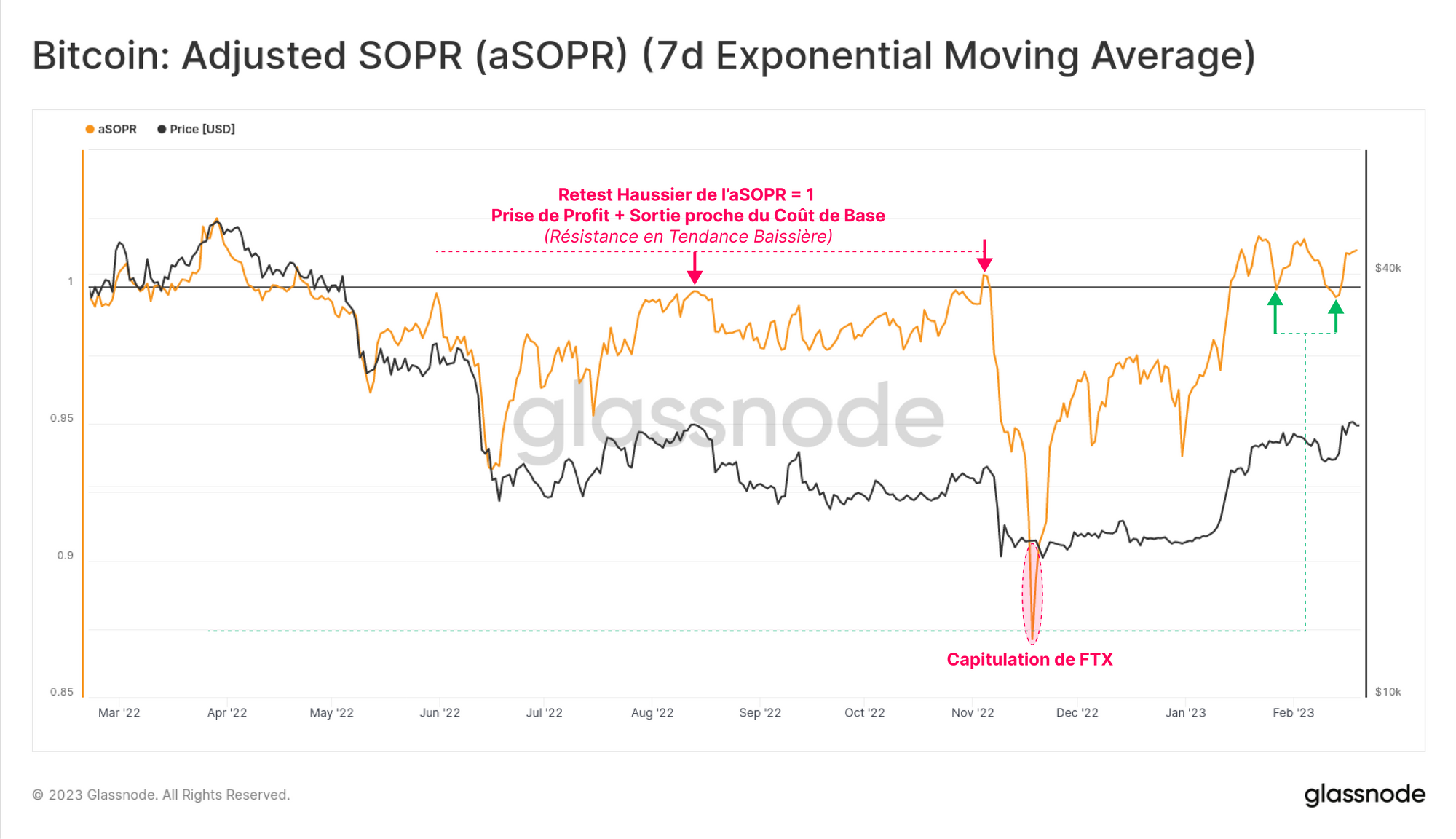 Un nouveau test du SOPR à 1,0 lors d'une impulsion haussière indique que la prise de bénéfices ralentit (ce qui serait autrement une pression à la hausse), et que les détenteurs de pièces à perte ralentissent également leurs dépenses (autrement une pression à la baisse).