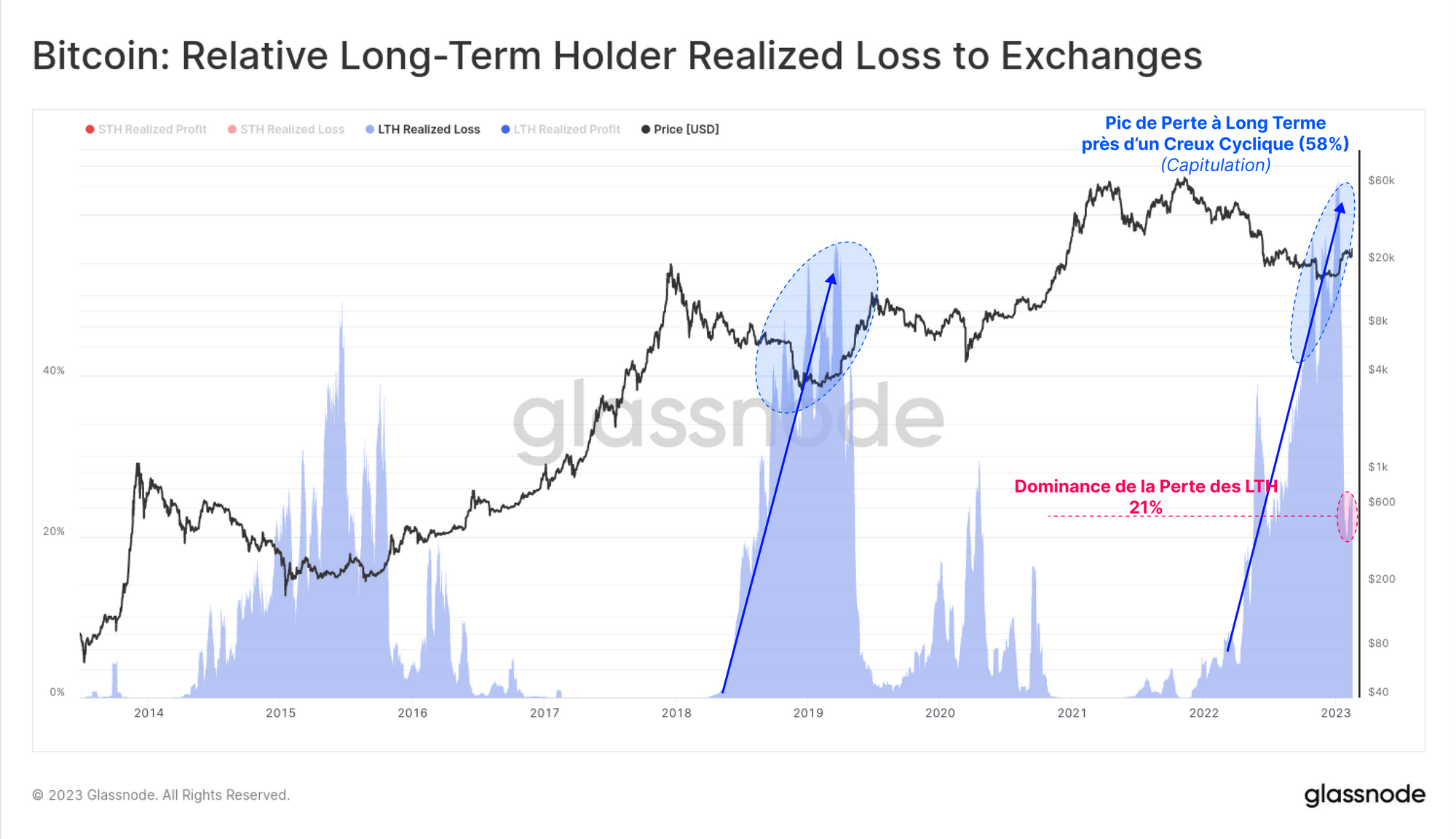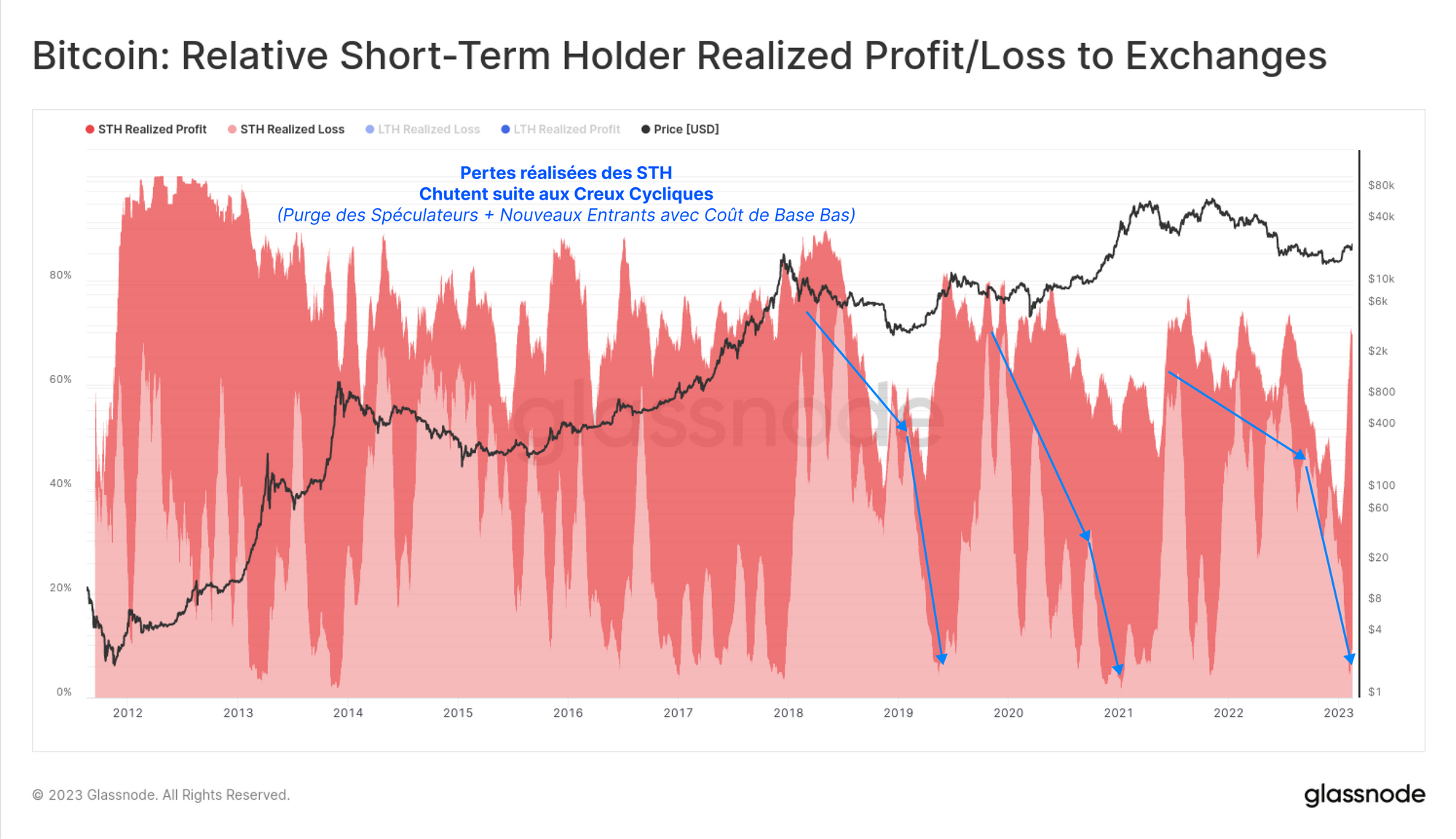 Nous pouvons observer un modèle de décroissance des pertes relatives des STH vers les creux cyclique du marché à mesure que les spéculateurs de la dernière heure sont éliminés et que les pièces sont transférées aux acheteurs qui construisent le plancher avec une base de coût inférieure.