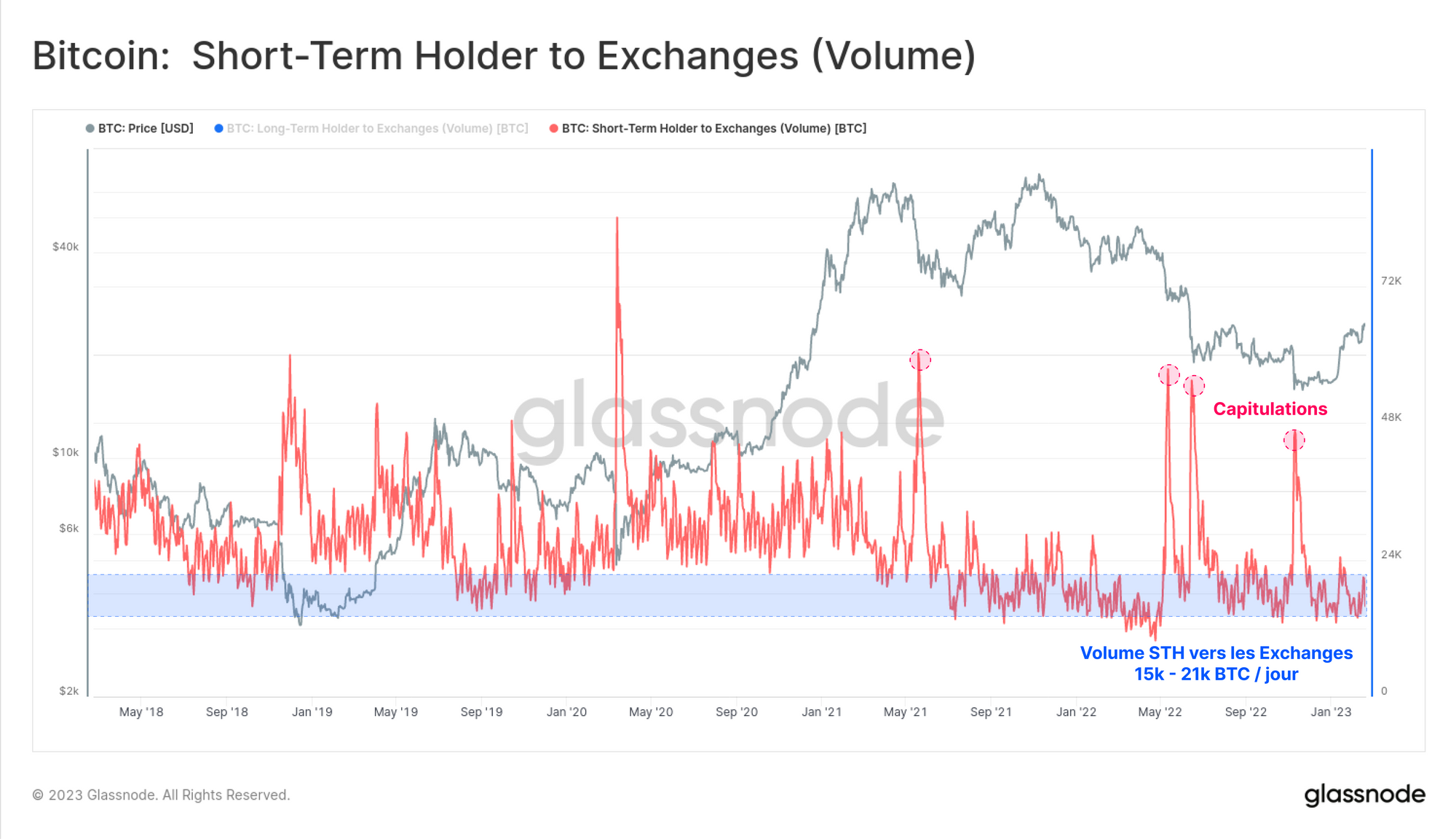Sur la base du volume de pièces en valeur absolue , les STH ne semblent toujours pas particulièrement motivés à envoyer des pièces aux exchanges pour le moment. Le volume total STH-Exchange oscille entre 15 000 et 21 000 BTC/jour, une fourchette similaire à celle observée depuis juin 2021.
