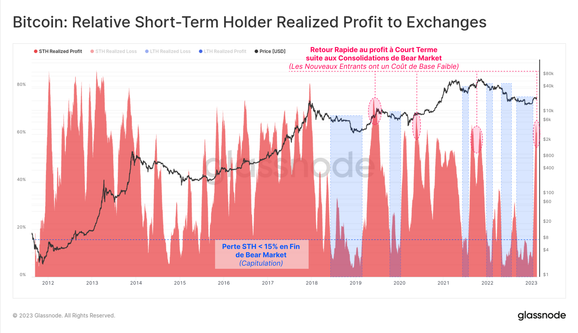Le graphique ci-dessous montre la part relative des pertes et profits réalisés réalisés par la cohorte des détenteurs à court terme, filtrée spécifiquement pour les pièces transférées vers les exchanges, afin de simuler au mieux les forces de vente.
