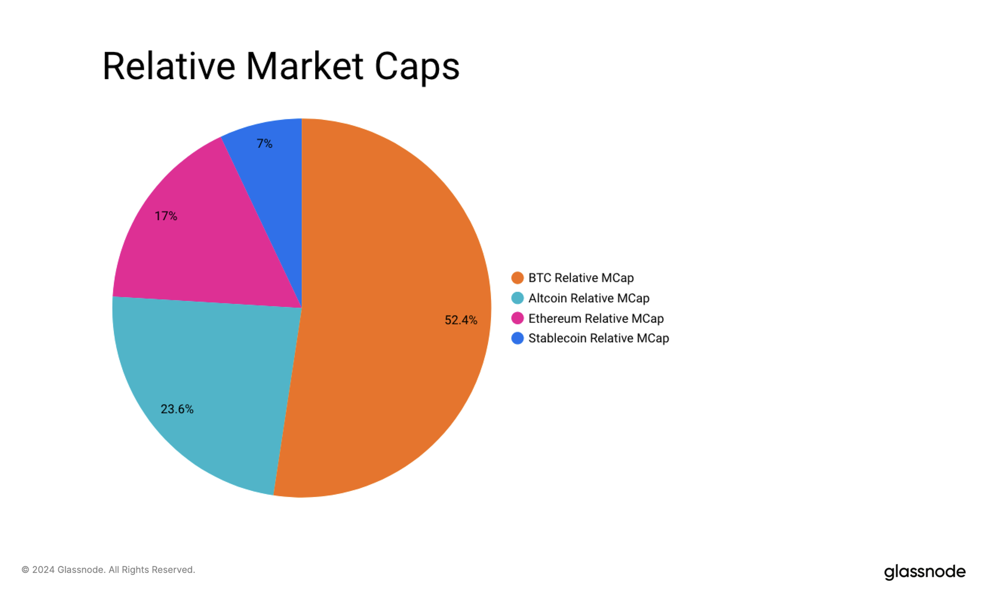 En termes de capitalisation boursière, le bitcoin reste en tête avec plus de 52 % de la valeur totale des actifs numériques. En revanche, l'ETH représente 17 %, les stablecoins 7 % et le reste du secteur des altcoins 24 %.