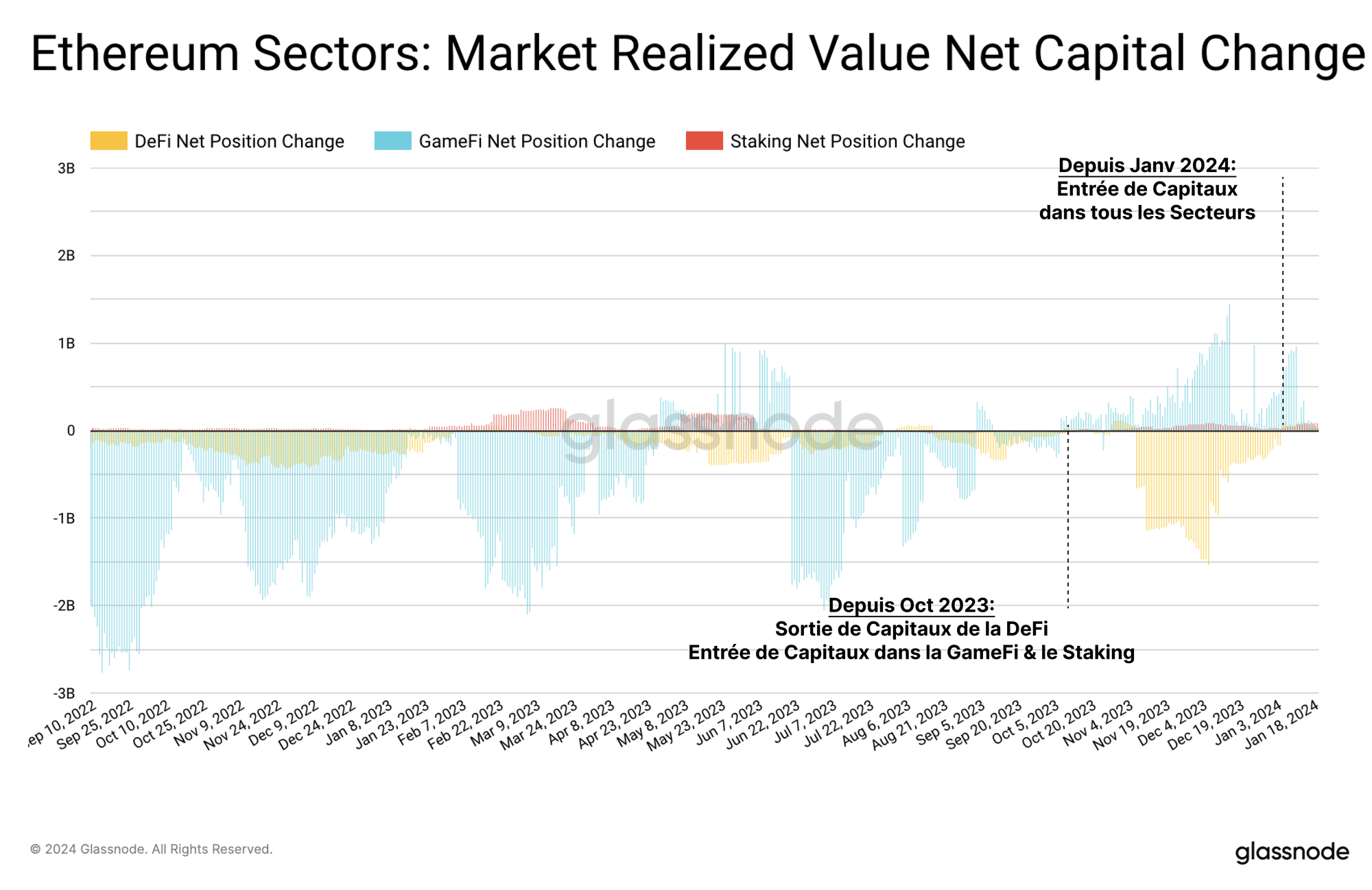 Au sein de l'écosystème Ethereum, nous pouvons distinguer trois secteurs principaux : la DeFi, la GameFi et le Staking. Depuis le début de l'année, les trois secteurs ont enregistré des entrées de capitaux, mais les secteurs DeFi et GameFi ont connu des sorties de capitaux relativement importantes tout au long de 2022 et 2023.