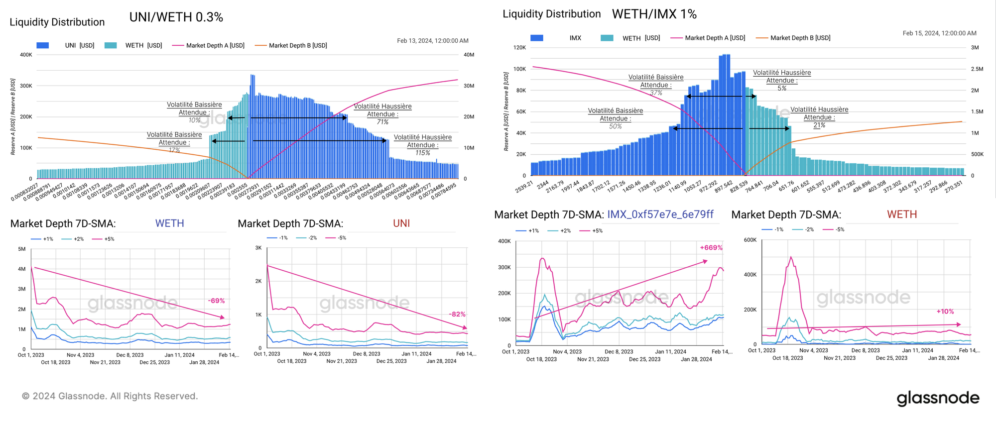 En observant le taux de changement dans la distribution de la liquidité, nous constatons une augmentation de la profondeur du marché pour les fourchettes de -5 % et +5 %, ce qui suggère que les fournisseurs de liquidités se préparent à une période de forte volatilité des prix.