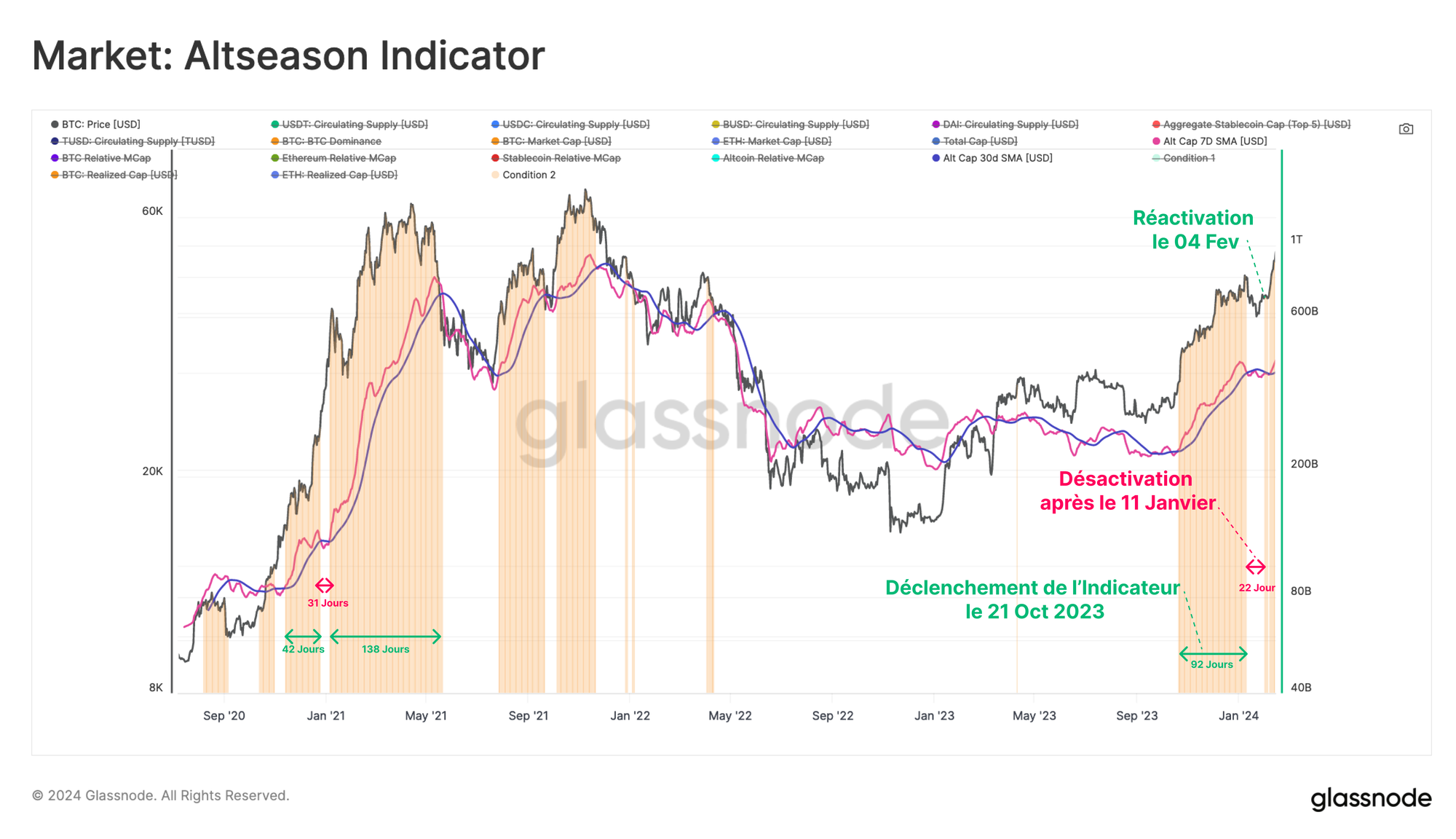 L'élan du marché à la suite des nouveaux ETF Bitcoin et l'anticipation d'un marché haussier commencent à créer des changements dans les flux de capitaux. Notre indicateur Altseason suggère une hausse plus mature et peut-être durable du marché des Altcoins, mais il reste relativement concentré sur les actifs à forte capitalisation pour le moment.