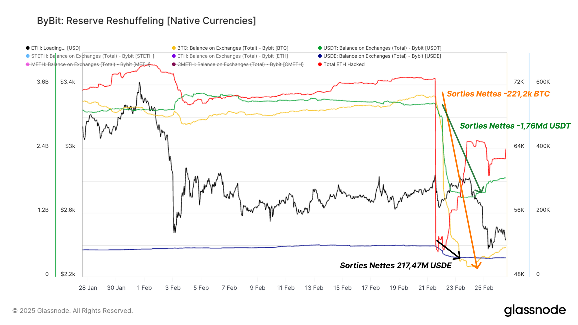 Le 24 février 2025, les réserves de Bybit en BTC, USDT et USDE ont connu d'importants retraits :