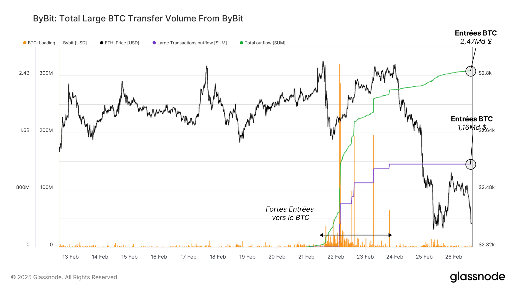 Tandis que Bybit s'efforçait de reconstituer ses réserves d'ETH, les sorties de BTC de l'exchange ont été considérables.