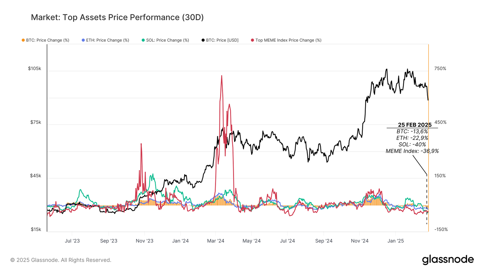 Une vaste correction du marché à la suite du piratage de Bybit a fait chuter la performance mensuelle de BTC à -13,6 %, tandis que l'ETH, le SOL et les memecoins ont subi des pertes encore plus importantes, ramenant leurs valeurs aux niveaux d'avril 2024.