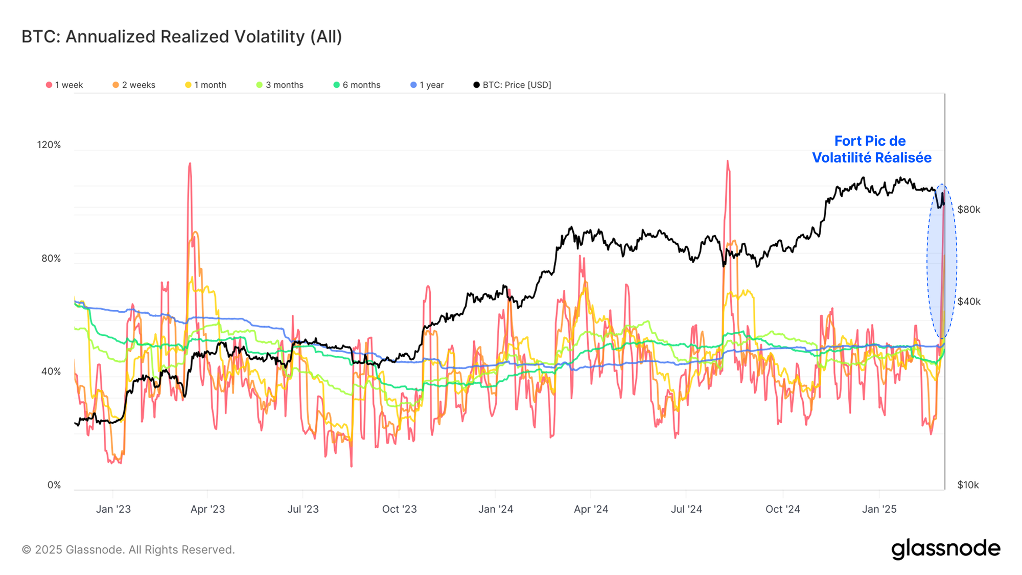 Nous pouvons constater que la volatilité réalisée pour le BTC a bondi sur plusieurs horizons temporels.