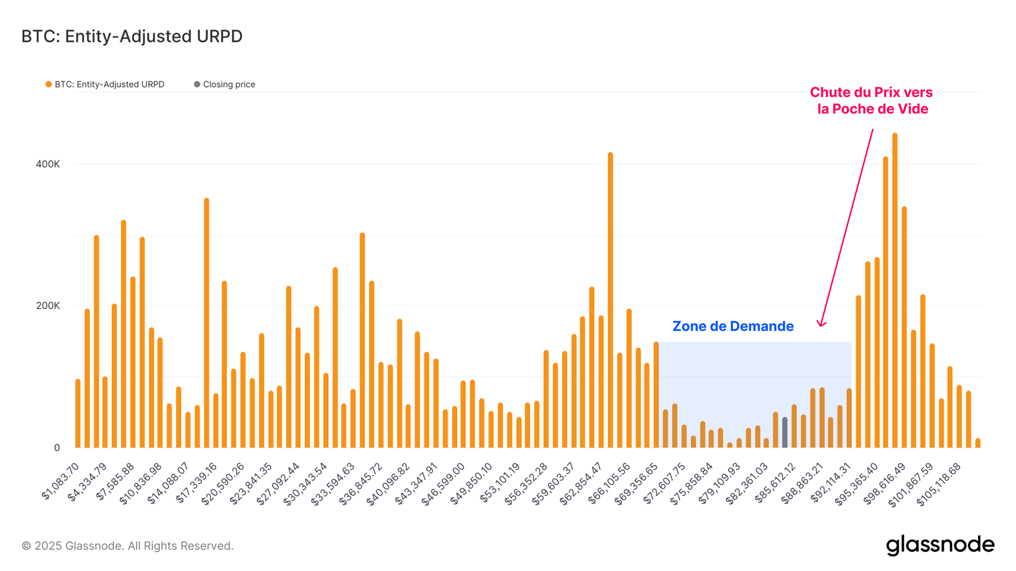 Notamment, l'effondrement initial des prix a amené le marché en dessous de 86 000 $, une zone où très peu de BTC avaient changé de mains auparavant.