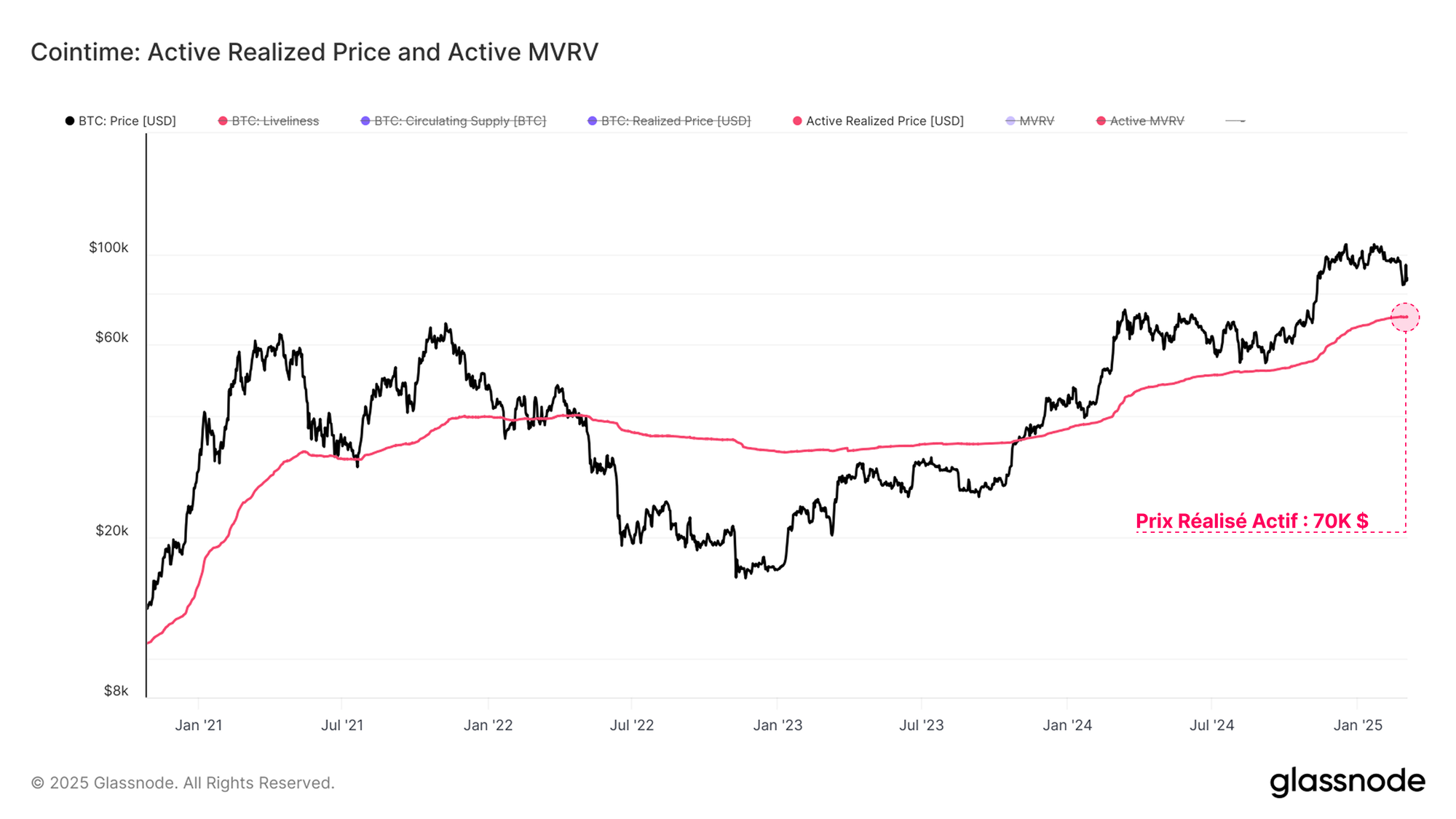 Avec 50 % de l'histoire au-dessus et en dessous du prix réalisé actif, on peut considérer ce niveau comme un seuil clé séparant un marché haussier d'un marché baissier.