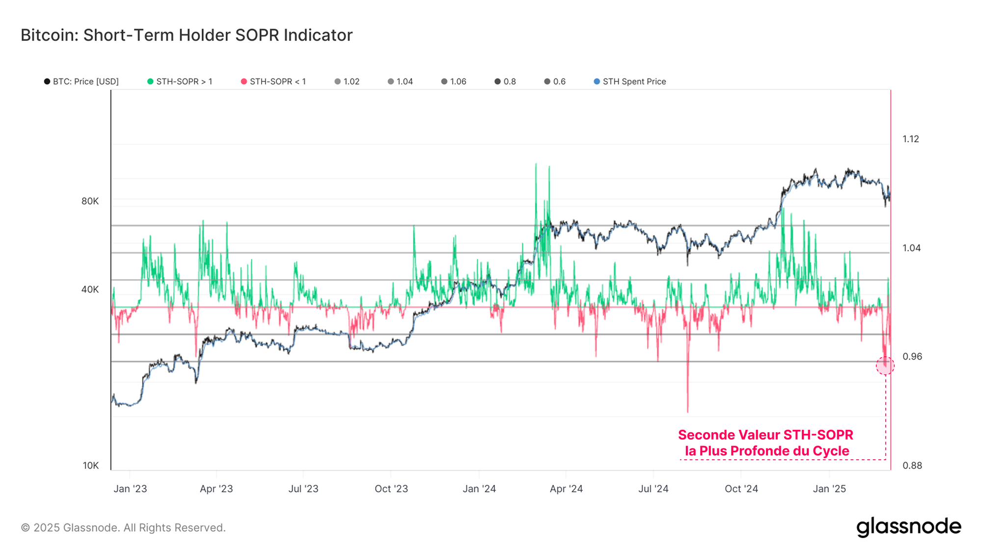 Du point de vue du SOPR, qui évalue le multiple de profit/perte moyen réalisé parmi les investisseurs, nous notons la première période de dominance des pertes depuis octobre 2024.