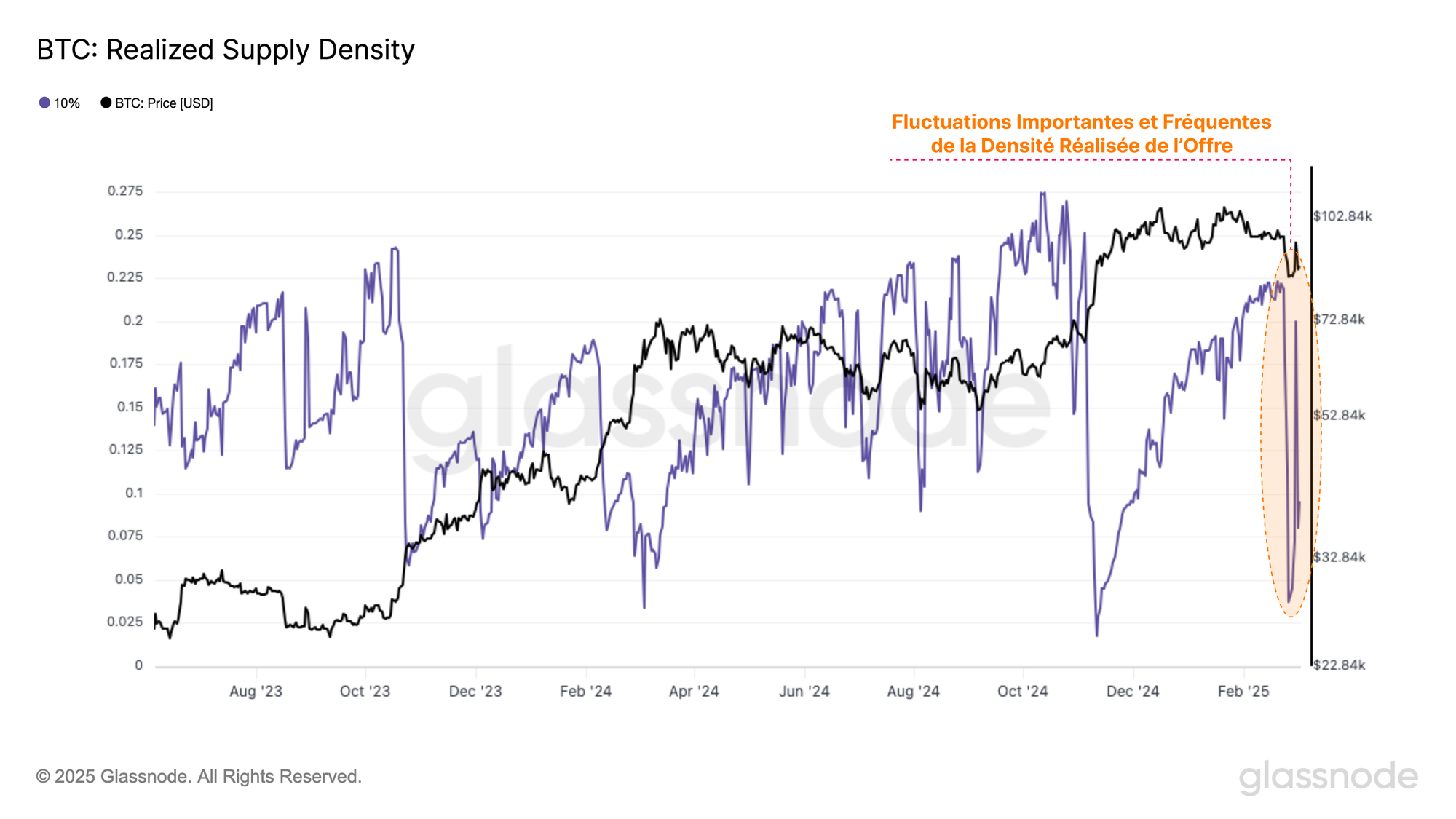 La mesure de la densité de l'offre réalisée quantifie l'ampleur de l'offre concentrée autour du prix spot actuel à ± 10 %. Lorsque l'offre est fortement concentrée autour du prix spot, de petits mouvements peuvent affecter de manière significative la rentabilité des investisseurs, ce qui peut à son tour amplifier la volatilité du marché.
