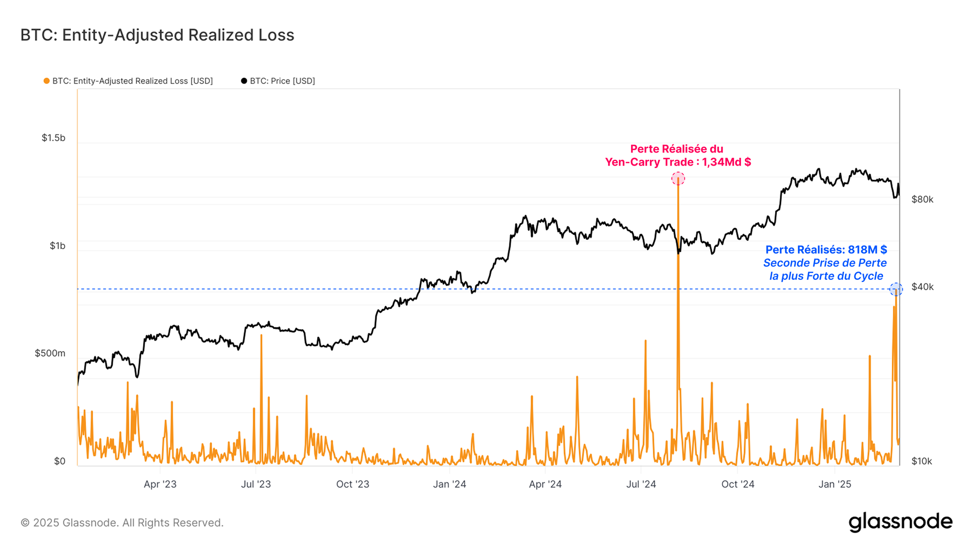 Une part importante de ces ventes provient de BTC qui prennent une perte. La perte réalisée par l'ensemble des participants au marché a atteint 818 millions $ par jour, seul la fin des stratégies de yen carry trade ayant enregistré une valeur plus importante (1,34 milliard $).