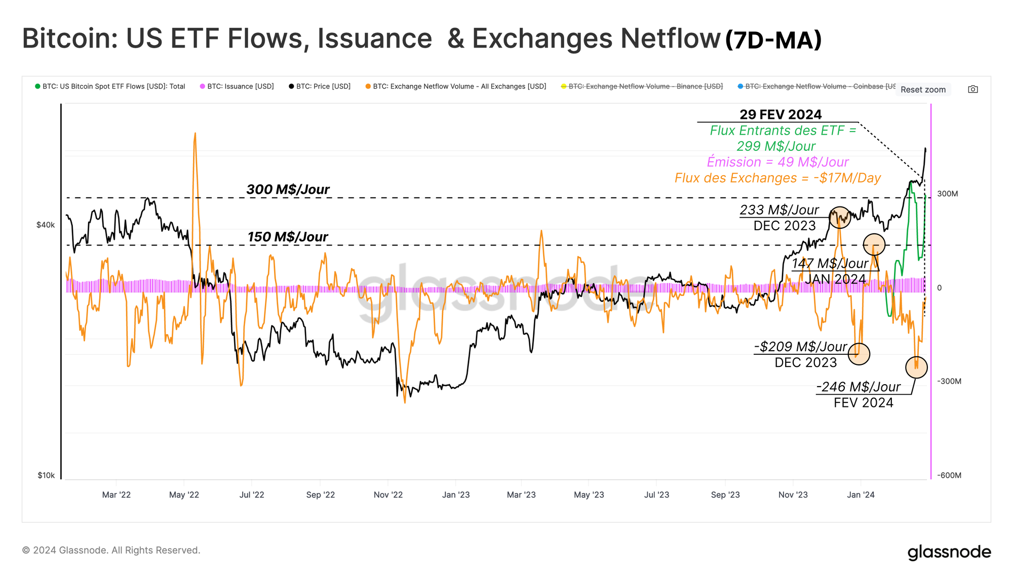 - Flux net des exchanges 🟧 : Si l'on se concentre sur les mois précédant la date d'approbation de l'ETF, les exchanges centralisés ont été témoins d'importantes variations des flux de capitaux. Depuis que les ETF lancé, cette mesure a montré une pression constante d'achat allant jusqu'à 246 millions de dollars / jour. À la fin de la semaine dernière, le flux net global des exchanges enregistrait une sortie de 17 millions de dollars / jour.