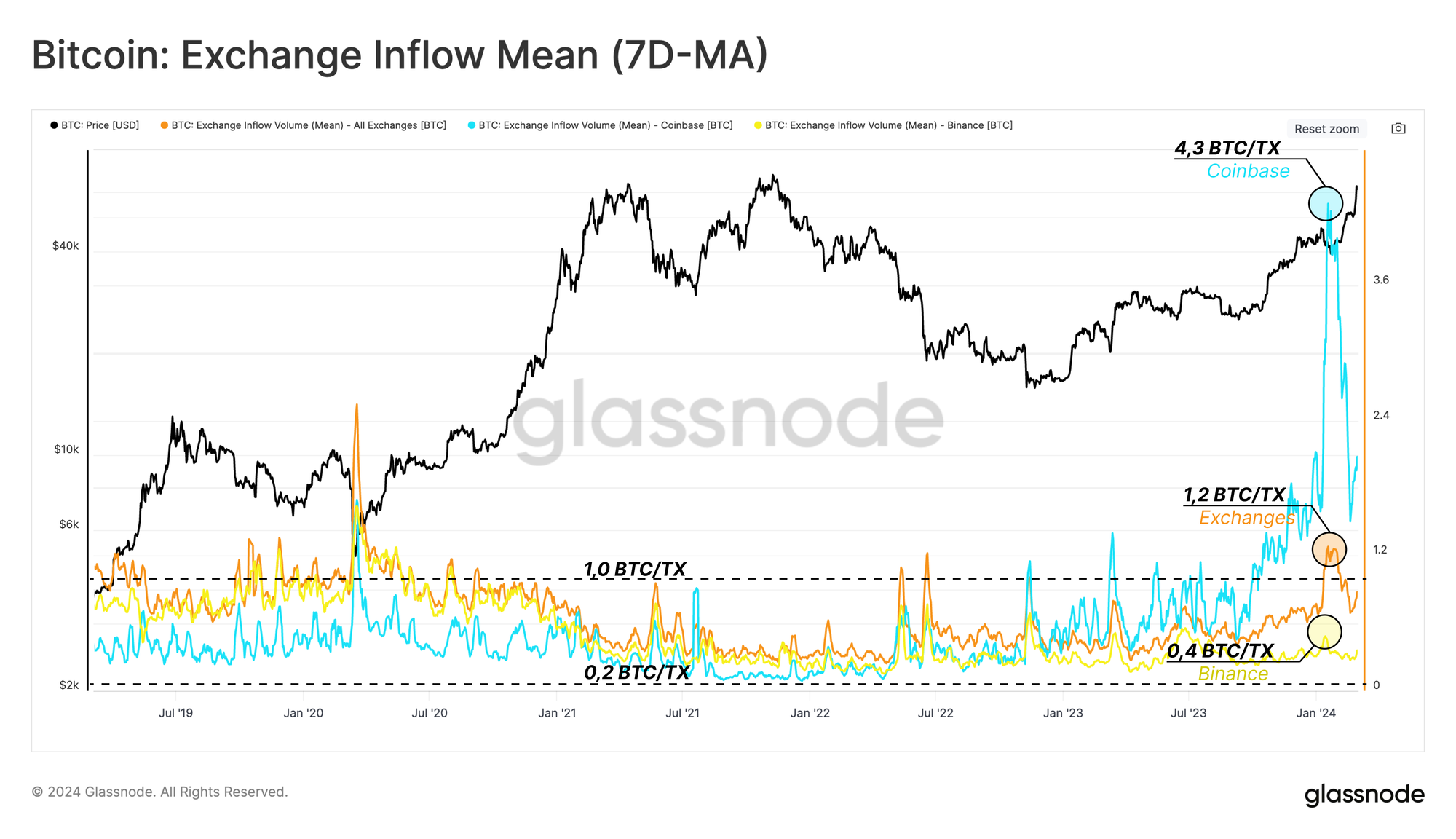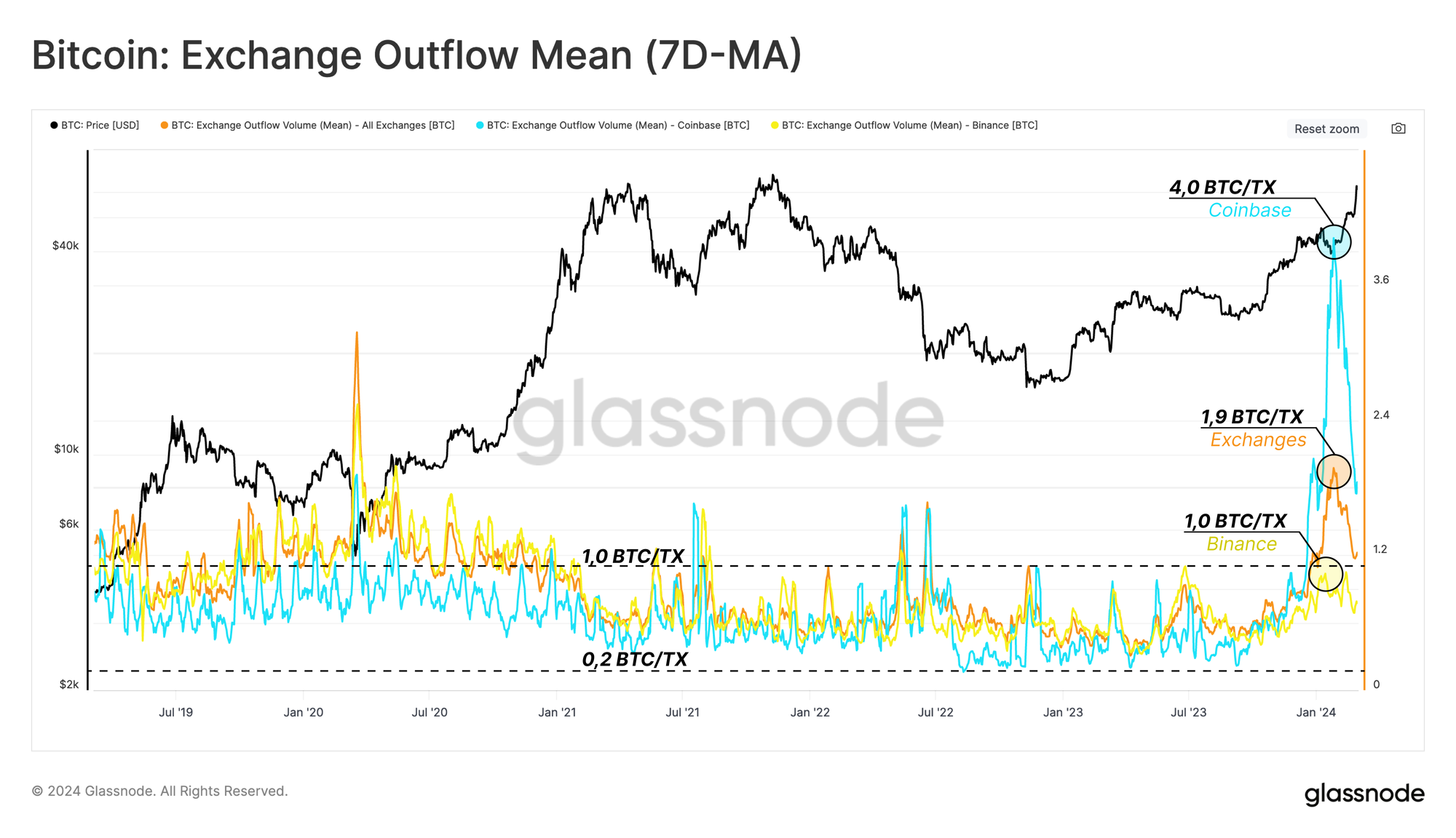 Le résultat montre que les transactions sortantes moyennes ont atteint des valeurs considérablement plus élevées en ce qui concerne Coinbase en particulier. La taille moyenne des transactions a culminé à 4,3 BTC/Tx au moment de l'approbation de l'ETF.