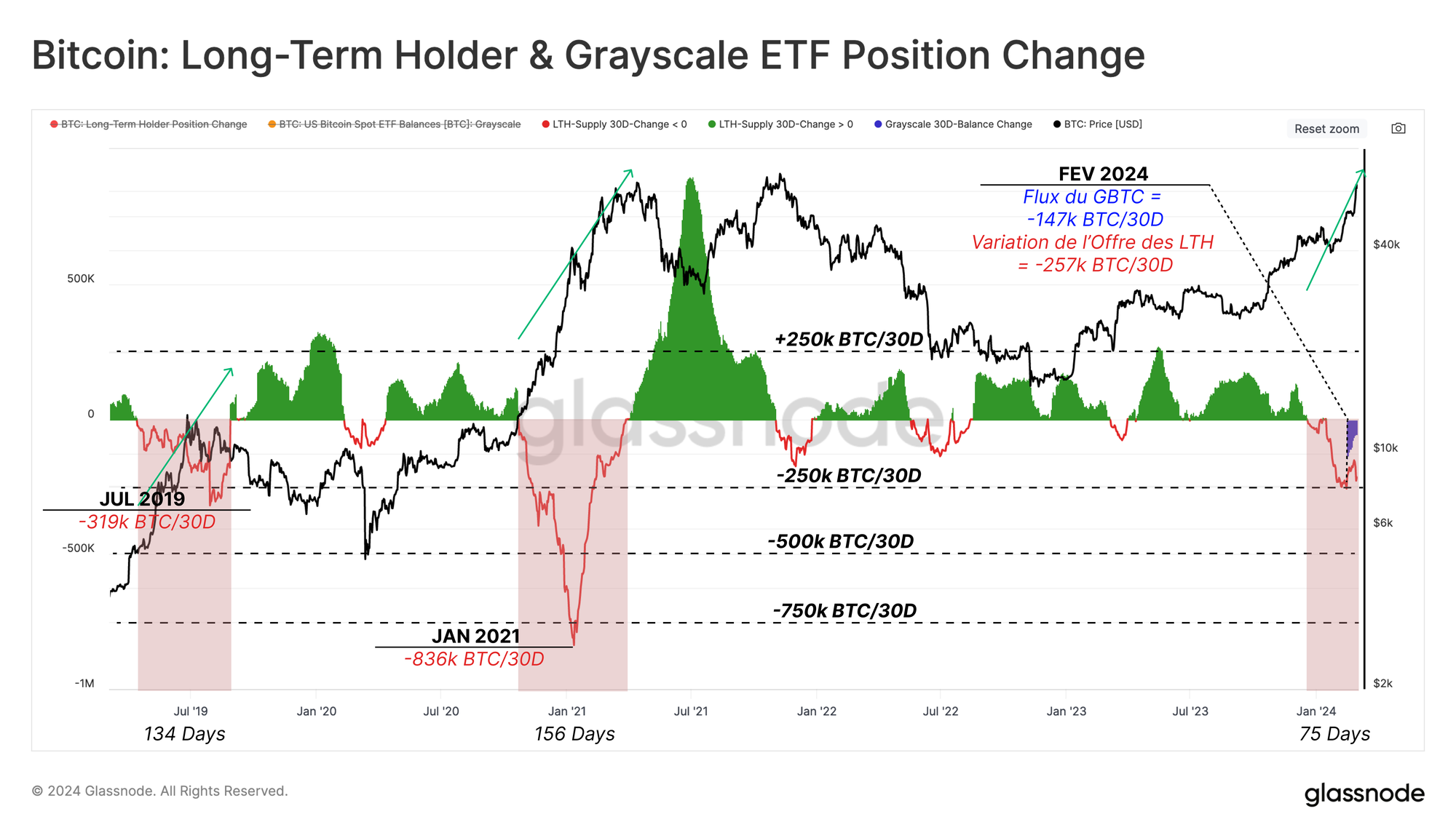 Le graphique suivant montre l'évolution mensuelle de l'offre des investisseurs à long terme. En zoomant sur les deux dernières grandes expansions du marché à la mi-2019 et au début de 2021, nous pouvons voir que le taux de distribution des détenteurs à long terme a atteint des pics de 319 000 BTC/mois et de 836 000 BTC/mois, respectivement.