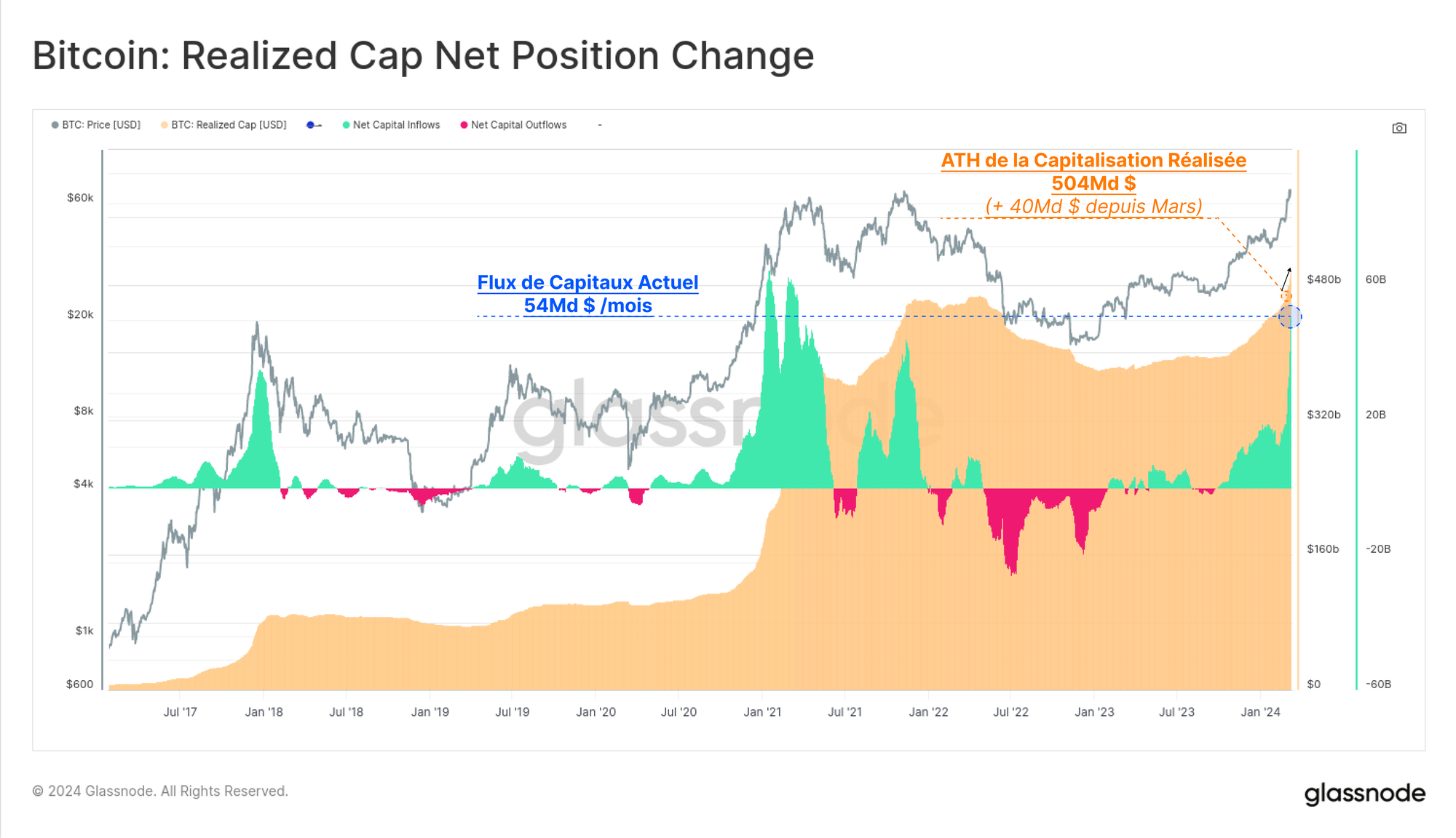 Le prix n'est pas le seul indicateur à avoir récemment atteint un nouveau sommet. La capitalisation réalisée du bitcoin, qui mesure la richesse totale stockée en BTC on-chain, a également atteint un nouveau sommet de 504 milliards de dollars, avec plus de 40 milliards de dollars d'entrées de capitaux depuis le 1er mars.