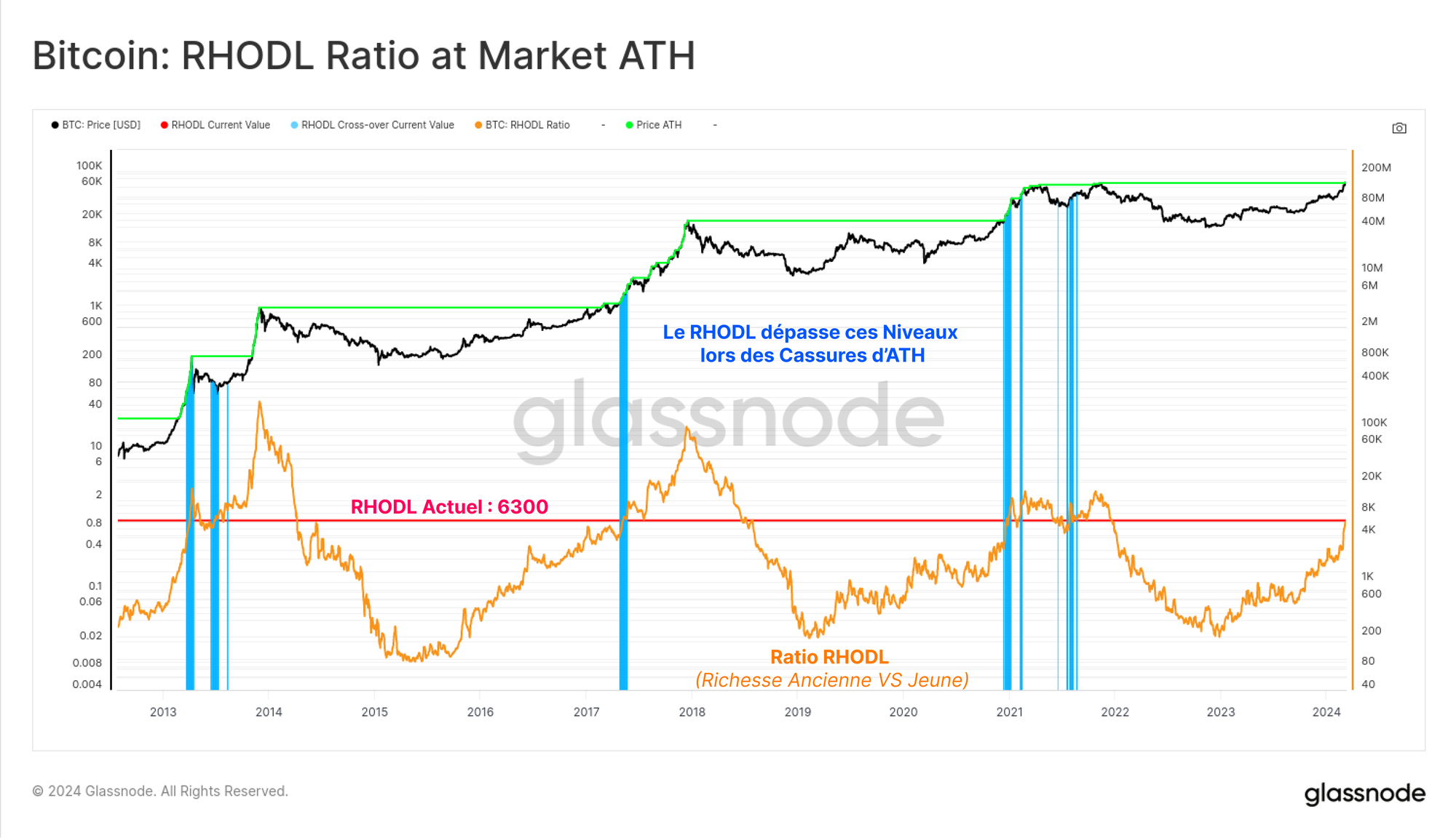 Le graphique ci-dessous indique en 🔵 les endroits où le ratio RHODL dépasse sa valeur actuelle de 6,3k.