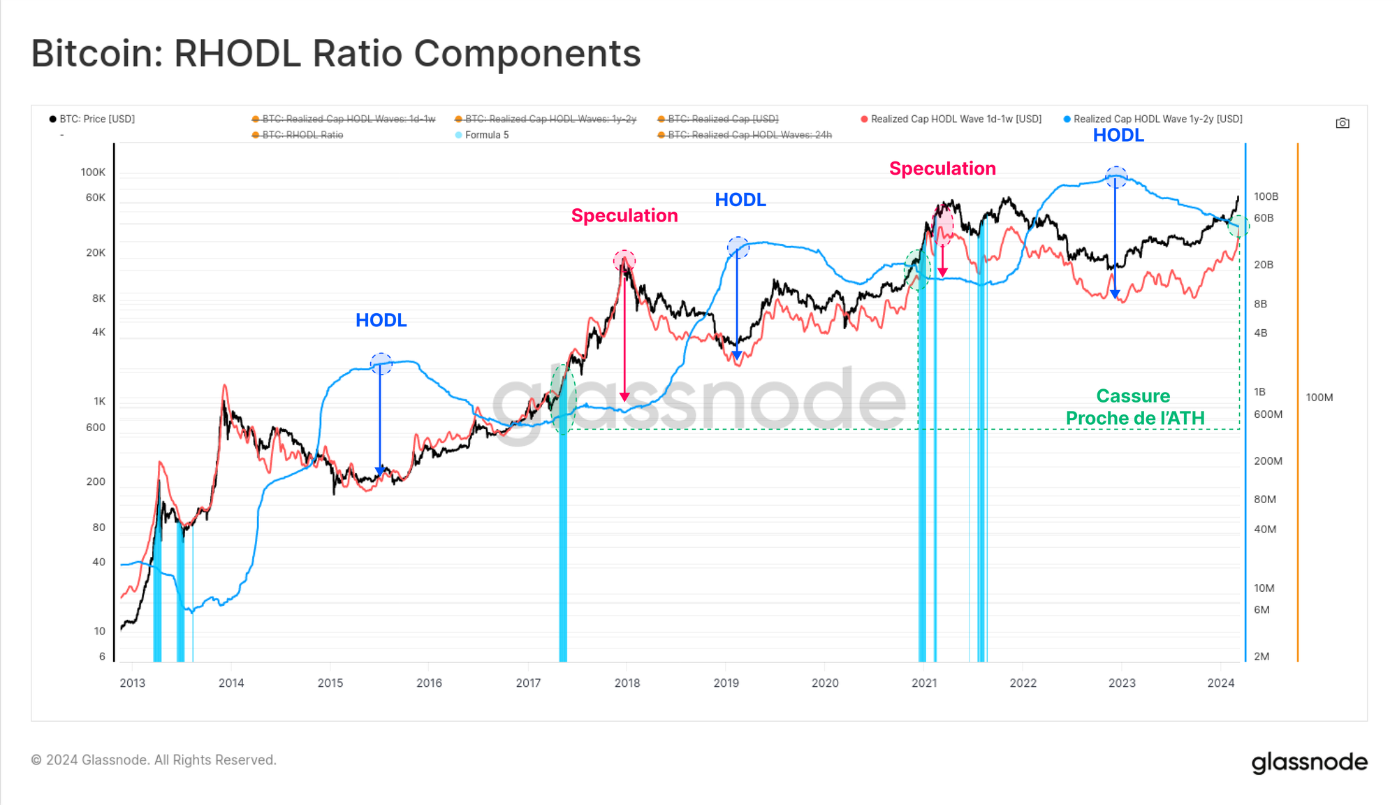 Le ratio RHODL est une autre métrique populaire pour suivre ce transfert de richesse des anciens HODLers vers les nouveaux investisseurs/spéculateurs.
