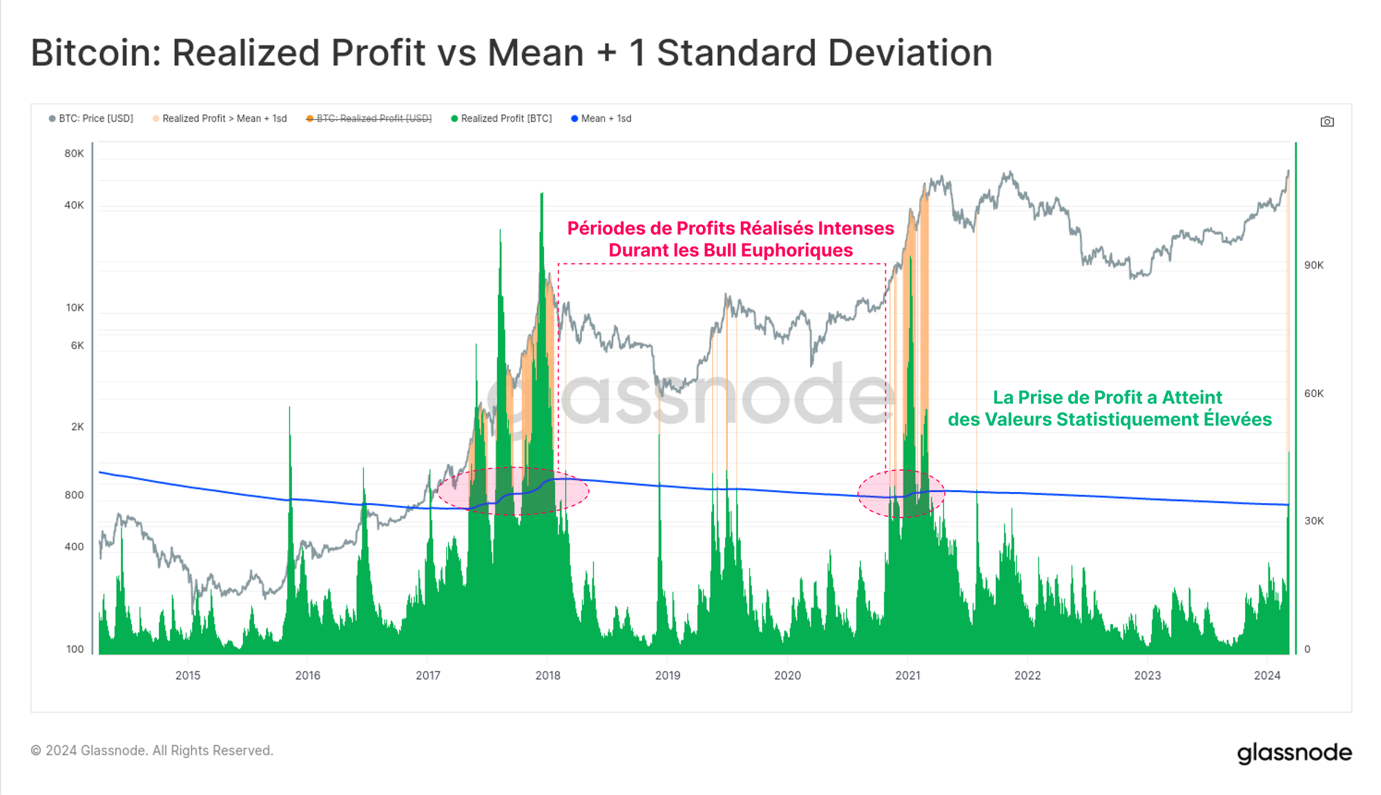 Le BTC a atteint son ATH, dépassant les 72 000 dollars et nous rapprochant d'un sentiment d'euphorie. Le transfert de capital classique des HODLers vers les spéculateurs est désormais bien entamé, avec des hausses significatives des prises de profits et de la demande d'effet de levier.
