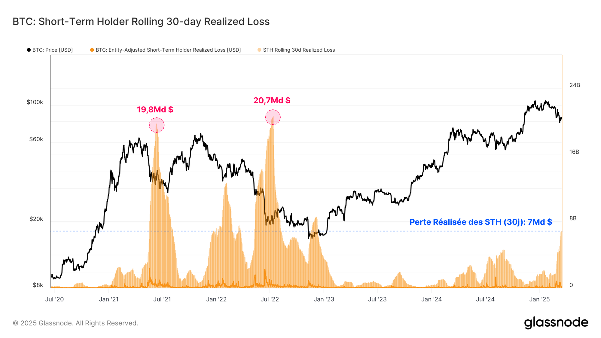Lorsque l'on évalue la somme des pertes des investisseurs à court terme sur 30 jours, on constate qu'une grande partie des nouveaux investisseurs a capitulé, le mouvement de vente actuel représentant la plus importante prise de perte (7 milliards $).